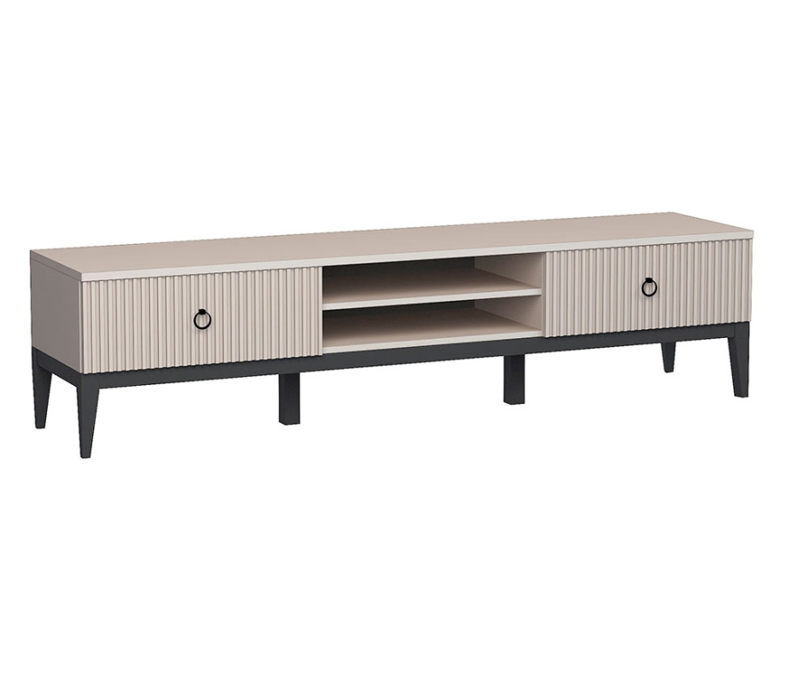 Характеристики:Цвет: кашемир серый;Цвет ручек: чёрный матовый;Наполнение тумбы: открытая ниша посередине с полкой из ЛДСП и 2 ящика.Материалы:Каркас: ЛДСП 1,6 см;Крышка: ЛДСП 2,2 см;Фасады: МДФ с фрезеровкой и окутаны плёнкой ПВХ;Ручки: металл;Опоры: деревянные с эмалевой отделкой серого цвета;Выдвижной механизм ящиков производства «Слорос» неполного выдвижения с доводчиком.