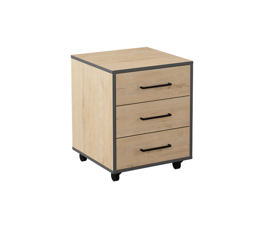 Характеристики:Тумба выкатная с тремя ящиками;Цвет: дуб бунратти, черный графит;Декоративные ручки в цвете «железо античное черное»;В выдвижной ящик можно класть не более 5-7 кг, при этом нагрузка должна быть распределена по всему дну (не класть тяжелые предметы, которые могут повредить и выдавить дно);Четыре колесные опоры, две из которых с тормозом;Для выдвижных ящиков используется система скрытых направляющих со встроенным демпфером, что обеспечивает более высокие потребительские свойства.Материалы:Для изготовления мебели используется ламинированная плита ДСП толщиной 16 и 22 мм класса эмиссии Е1;Фасады ящиков: ЛДСП 22 мм;Для облицовывания кромок деталей используется высококачественный материал;Декоративные ручки металлические;Крепежная фурнитура и механизмы ведущих производителей.
