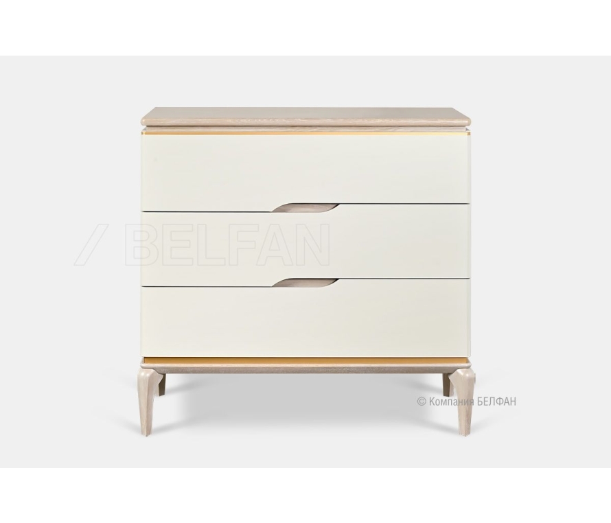 Комод «Алекса» 3 ящика, выполненный в стиле современная классика, имеет неповторимый дизайн, благодаря сочетанию благородной текстуры дуба и сатиновых фасадов с эффектом сияния. Золотая патина придает объем и подчеркивает утонченность изделия. Комод станет не только стильным элементом вашей спальни, но и незаменимым предметом мебели, так как его функциональность нисколько не уступает его красоте. Сочетание выдвижных ящиков и распашных дверей позволит вам легко и комфортно использовать комод для хранения самых разнообразных вещей. Особенности комода «Алекса»: ? Изящные гнутые ножки из массива дуба. ? Сочетание распашных дверей с выдвижными ящиками. ? Удобство эксплуатации достигнуто благодаря специальным профиль-нишам (выемкам для открывания). ? Ящики и двери имеют качественные направляющие и доводчики (пр-ва Австрии) для плавного и бесшумного закрывания. ? Экологичное покрытие - окрашено краской и лаком на водной основе. ? Изделие выполнено из массива и шпона дуба и окрашенного МДФ.