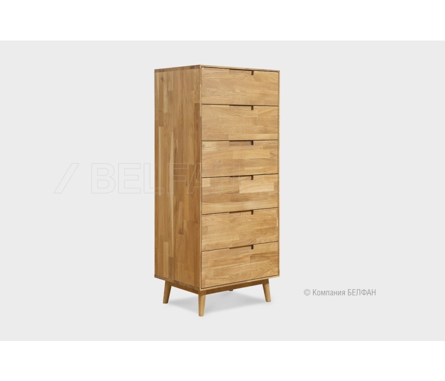 Коллекция «Ирвинг» вдохновлена эстетикой Mid-century modern, где лаконичность форм и функциональность объединены с изысканным вкусом. Отличительная особенность — высокие тонкие ножки, тонкие корпуса и простота линий, создающая легкость даже в компактных помещениях. Такая мебель не утяжеляет интерьер, а наоборот — придаёт ему архитектурную ритмику, позволяя пространству «дышать». Комод «Ирвинг» 6 (высокий) — это воплощение вертикальной элегантности в стиле Mid-century modern, где тонкие скошенные ножки, прямые линии корпуса и отсутствие лишнего декора создают утончённую геометрию. Функциональные особенности ? Высота — 1395 мм, при компактной ширине 600 мм, идеально подходит даже для небольших помещений. ? Эргономичная глубина 450 мм позволяет разместить комод в узких зонах — например, в проходе, возле окна или на входе в гардеробную. ? Шесть выдвижных ящиков обеспечивают вместительное хранение вещей, от белья и одежды до документов или аксессуаров. ? Три варианта крашения: «бейц-масло», «беленый дуб» и «графит» Экологичность и материалы ? Комод изготовлен из массива дуба. ? В качестве покрытия используется бейц-масло на натуральной основе, оно подчёркивает природный рисунок древесины и сохраняет её тактильную теплоту. В интерьере Высокий комод «Ирвинг» идеально подойдёт для: — спальни — как вертикальное хранилище белья и одежды. — холла или коридора — как акцентный и полезный элемент. — кабинета или гостиной — как лаконичный органайзер. Особенно красиво он смотрится рядом с другими изделиями коллекции «Ирвинг»: кроватью и прикроватными тумбами. Благодаря универсальному дизайну и природной эстетике дуба, изделие легко вписывается как в скандинавский, так и в экостиль. Рекомендации по сочетанию ? В отделке «бейц-масло»— идеально с тёплыми стенами, светлым текстилем и зелёными растениями. ? В «графите» — акцентно смотрится в минималистичных интерьерах с серыми или бетонными стенами. ? «Белёный дуб» отлично сочетается с пастельными оттенками, белыми шторами и светлыми коврами. Рекомендации от BELFAN: Мы рекомендуем воспользоваться услугой профессиональной сборки от BELFAN — чтобы сохранить гарантию и быть уверенными в точной установке всех элементов. Мебель из массива дерева необыкновенно красива, добротна и славится своим долголетием. Однако, чтобы продлить этот срок, сохранить мебельным изделиям первоначальную элегантность и отличный внешний вид, за ней необходим надлежащий уход. Если у вас появились царапины, следы от кружки или мокрой тряпки, то сервис-бокс от компании BELFAN поможет вам вернуть мебели первозданный вид даже в домашних условиях. Данный сервис-бокс подходит только для мебели в крашении бейц-масло.