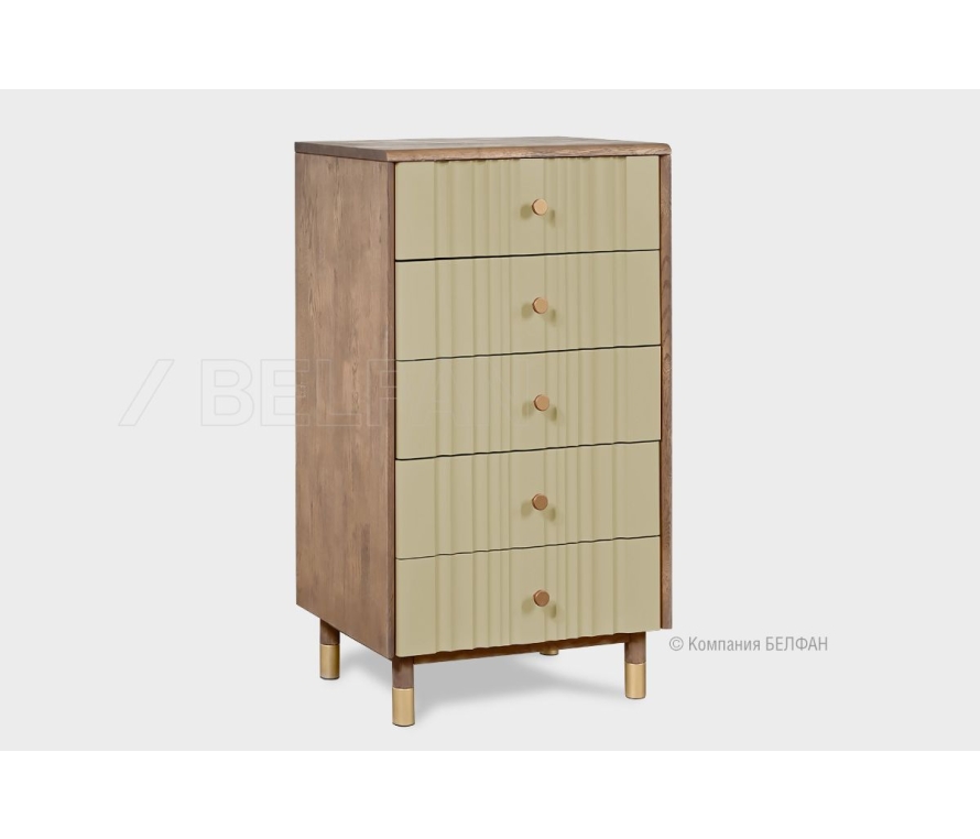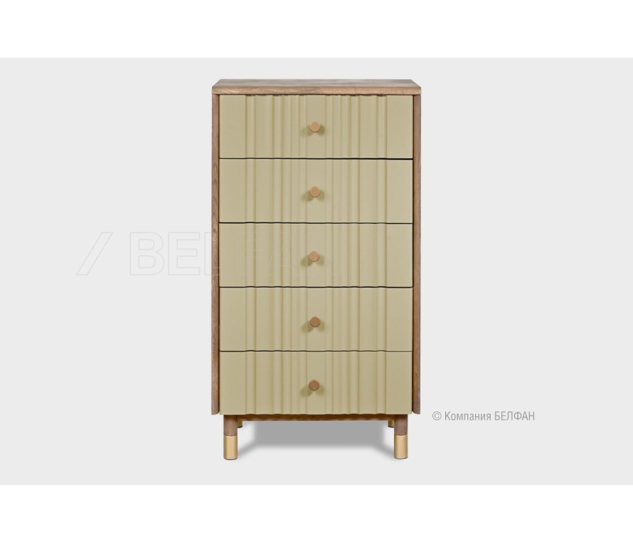 Вдохновлённая движением атласной ткани, коллекция «Меридиан» — это воплощение артистичного подхода к современному интерьеру. Лёгкость форм, графичные волны фрезеровки, высокие ножки и позолоченные акценты делают каждый предмет в коллекции изысканным, но не вычурным. Он будто создан для тех, кто умеет ценить детали и стремится окружить себя эстетикой каждый день. Комод «Меридиан» 5 (высокий) — это утончённое решение для компактного и элегантного хранения. Вертикальная композиция из пяти ящиков делает его визуально лёгким, но при этом вместительным и функциональным. Функциональные особенности: ? Размеры: ширина 600 мм, высота 1120 мм, глубина 452 мм — идеален для небольших пространств или акцента в интерьере. ? Хранение: 5 выдвижных ящиков, удобных для хранения белья, аксессуаров или личных вещей. ? Крашения: широкий выбор цветовых сочетаний, от светлых до глубоких древесных оттенков — под любой интерьер. Экологичность и материалы ? Материалы: массив дуба и МДФ — гармония прочности и выразительности. ? Покрытие: краски на водной основе и натуральное масло — безопасно, экологично, с акцентом на фактуру дерева. В интерьере Этот высокий комод прекрасно дополнит спальню, гардеробную или зону отдыха. Он добавит вертикальную динамику в пространство и создаст визуальную гармонию рядом с зеркалом, креслом или декоративными элементами. Особенно выигрышно смотрится в сочетании с другими изделиями коллекции «Меридиан». Рекомендации по сочетанию ? С изделиями коллекции «Меридиан»: комбинируется с тумбами, туалетным столиком и кроватью из той же линии. ? Сопутствующие аксессуары: дополняется изящным зеркалом, бра в латунном корпусе или кашпо в пастельных тонах. Рекомендация от BELFAN: Изделие поставляется в собранном виде, дополнительной сборки не требуется.