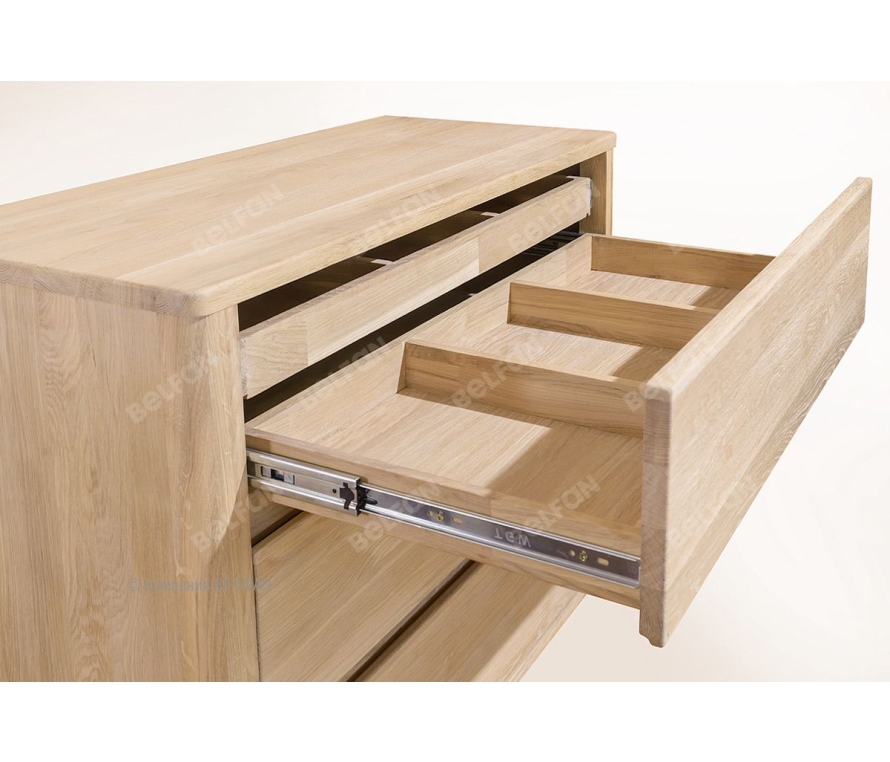 Стиль Лофт, в котором выполнен комод «Норд» – это светлые тона, натуральные материалы и национальное своеобразие. Минималистические фасады комода, которые лишены ручек, находятся на пике мебельной моды. Зато выдвижные ящики могут похвастаться оригинальными и практичными профиль-нишами – специальными выемками на краях для максимально удобного открывания. А направляющие с доводчиками производства Германия обеспечат плотное и бесшумное закрывание ящиков. Особенности комода «Норд» (Nord): ? Комод изготовлен из 100% массива дуба. ? Современный стиль – экоминимализм. ? Безупречный минималистичный дизайн, который идеально подойдет для квартирного и загородного решения. ? Прямые скруглённые формы идеально дополнят любой современный интерьер. ? Цельные скругленные боковины изделия из благородного массива дуба, которые придают формам мягкость и утонченность. ? Гладкие фасады без лицевой фурнитуры с интегрированными скруглёнными нишами для удобства открывания. ? Ярко-выраженный природный рисунок натурального дерева, искусно подобранный мастерами вручную. ? В комоде установлены 3 основных функциональных ящика для удобства хранения ваших вещей. ? В верхнем ящике комода спрятан дополнительный выдвижной ящик для хранения мелких особо ценных вещей. ? Надежные направляющие с доводчиками полного выдвижения (европейского пр-ва) обеспечат плотное и бесшумное закрывание ящиков и комфорт ежедневного использования. ? Экологичная отделка: натуральный дуб пропитан бейц маслом (европейского пр-ва) на натуральной основе. На поверхности образуется защитная гидрофобная пленка, благодаря которой покрытие впитывается в структуру дерева, придавая дереву стойкую защиту и подчеркивает природную красоту рисунка. Мебель из массива дерева необыкновенно красива, добротна и славится своим долголетием. Однако, чтобы продлить этот срок, сохранить мебельным изделиям первоначальную элегантность и отличный внешний вид, за ней необходим надлежащий уход. Если у вас появились царапины, следы от кружки или мокрой тряпки, то сервис-бокс от компании BELFAN поможет вам вернуть мебели первозданный вид даже в домашних условиях. Данный сервис-бокс подходит только для мебели в крашении бейц-масло. Примерьте комод «Норд» у себя дома! Пройдите по ссылке. Видеообзор комод Норд