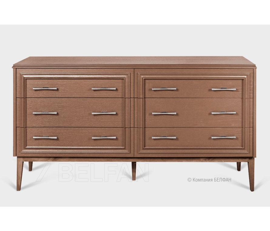 Комод «Сакраменто», 6 ящиков из дуба. Особенности комода с шестью ящиками «Сакраменто»: ? Современный дизайн: американская классика. ? Высокие ножки изделия создают эффект пространственной легкости. ? Прямые лаконичные формы. ? Изящный декор на фасадах в виде багетной рамы создает эффект многоуровневости и классического звучания. ? Эффектная лицевая фурнитура итальянского производителя Bosetti Marella подчеркивает индивидуальность каждого изделия . ? Сочетание глубоких эмалевых оттенков крашения с натуральной текстурой дерева оттенка орех. ? Три больших вместительных ящика для одежды или постельного белья. ? Багетная рама (декор на фасадах), ножки и царговый пояс изделия изготовлены из массива дуба. ? Фасады, столешница, боковые стенки изделия изготовлены из шпонированного дубом МДФ класса безопасности Е1. ? В покрытии изделия используются краски на водной основе и масло из натуральных компонентов, что свидетельствует о безопасности и соответствует высоким стандартам качества. ? Ящики оснащены направляющими с доводчиками (Европейского пр-ва) для комфортного пользования. Видеообзор спальня Сакраменто