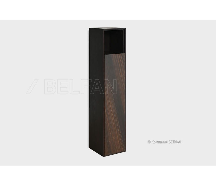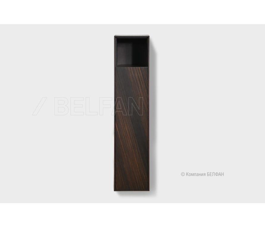 Особенности узкого правого настенного шкафа «Монреаль» (Monreal): ? Современный минималистичный дизайн с функциональным использованием. ? Акцентные фасады с ярким рисунком благородного кедрового шпона, расположенного под углом в 45 градусов, что придает изделию уникальный вид. ? Контрастное крашение: сочетание темного шоколадного корпуса и ярких фасадов. ? Утонченный корпус изделий. ? Отсутствие лицевой фурнитуры. ? Корпус изделия изготовлен из шпонированного дубом МДФ класса безопасности Е1. ? Фасад изделия изготовлен из МДФ класса безопасности Е1, который облицован кедровым мультишпоном. ?Покрытие выполнено европейским экологически чистым матовым лаком, что делает мебель максимально безопасной для здоровья, а так же подчеркивает красоту натурального дерева. ? Легкое открывание двери за счет механизма Push-to-Open, который активируется путем нажатия на фасад. Схема шкафа: