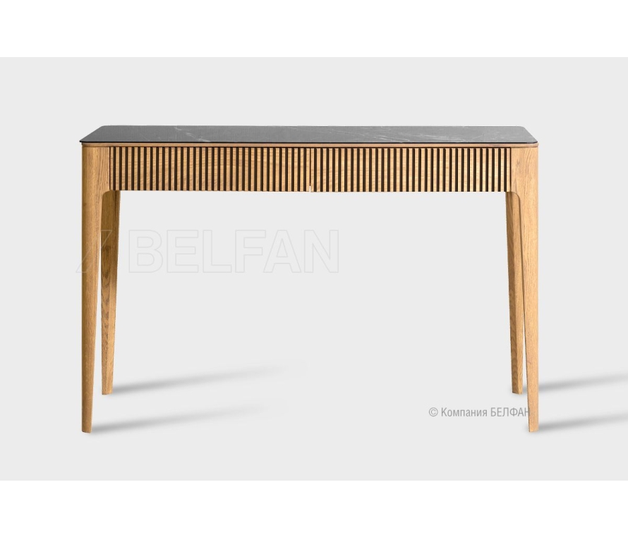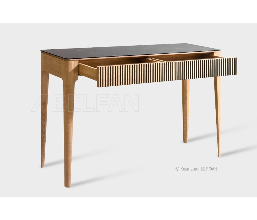 Особенности туалетного стола «Bergamo» (Бергамо):: ? Сочетание самых последних трендов современной мебельной моды. ? Мягкие плавные линии обраченные в минималистичность форм придадут интерьеру эстетичность. ? Высокие изящные ножки в сочетании с утопленными столешницами изделий создают эффект пространственной легкости. ? Цельные скруглённые стойки, переходящие в боковины, придают каждому изделию особое изящество, делая предметы цельными и утонченными. ? Яркий тренд мебельной моды – глянцевая стеклянная столешница с высочайшим качеством печати, имитирующая рисунок темного мрамора ? Сложная геометрическая фрезеровка на фасадах имитирует стекающую лаву, подчеркивая уникальность дизайнерской мысли. ? Яркий рисунок благородного дуба подчеркивает натуральность и индивидуальность изделия. ? 100% массив дуба. ? Столешница изготовлена из глянцевого каленого стекла. ? Изделия покрыты высокопрочным итальянским паркетным маслом «Borma». Покрытие позволяет подчеркнуть красоту натурального дуба, оно придает поверхности твердость, повышает водостойкость и износостойкость, изделие не темнеет со временем. Схема стола: