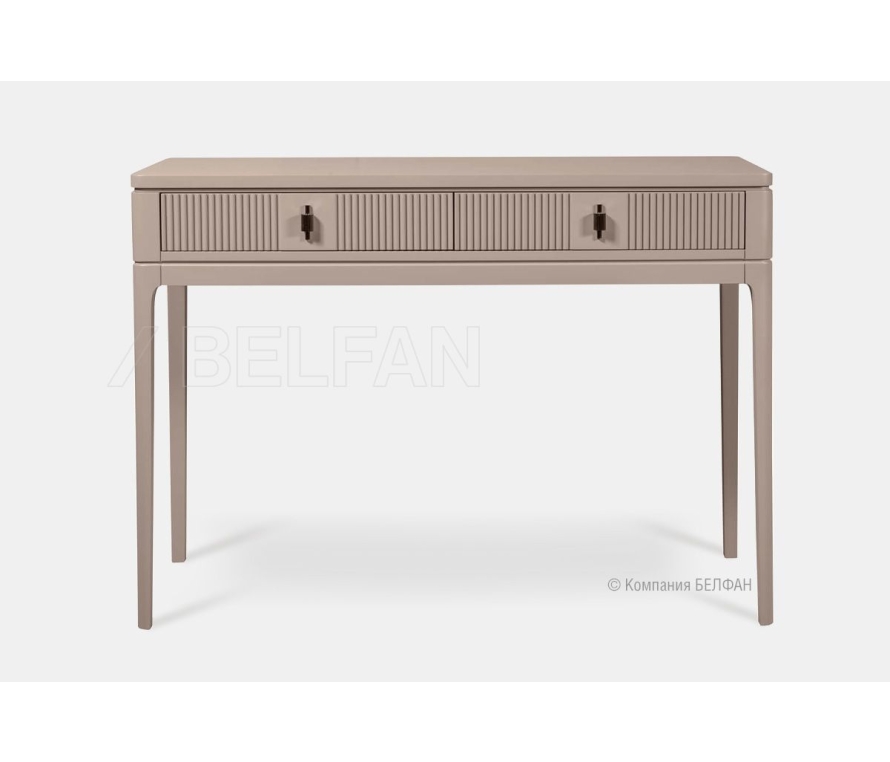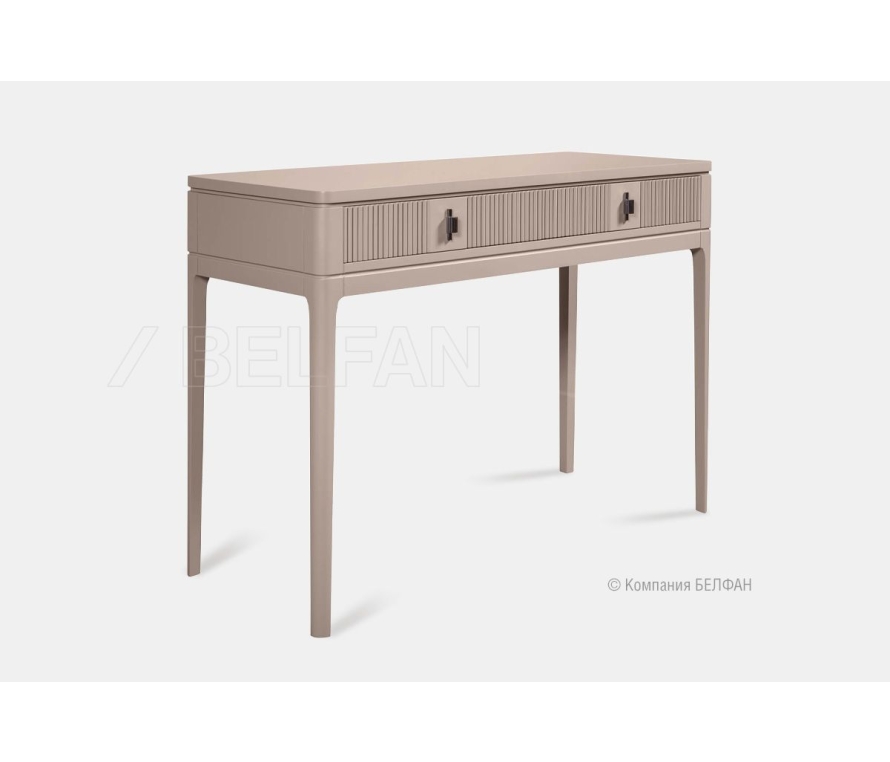 Особенности туалетного стола «Dune» (Дюна): ? Современный классический дизайн по последним европейским трендам. ? Эффектные фасады с графичной фрезеровкой, украшенные стильной дизайнерской фурнитурой, придают коллекции уникальность и респектабельность . ? Soft forms – прямые лаконичные формы с плавными линиями и углами придают особенное изящество предметам коллекции. ? Высокие утонченные ножки создают эффект пространственной легкости. ? Ножки изделий изготовлены из массива березы. ? Корпус, фасады, столешница изготовлены из МДФ европейского качества. ? В покрытии изделия используются лаки и краски на водной европейского производства, что свидетельствует о безопасности и соответствует высоким стандартам качества. ? Ящики оснащены направляющими скрытого монтажа с доводчиками (Европейского пр-ва) для комфортного пользования.