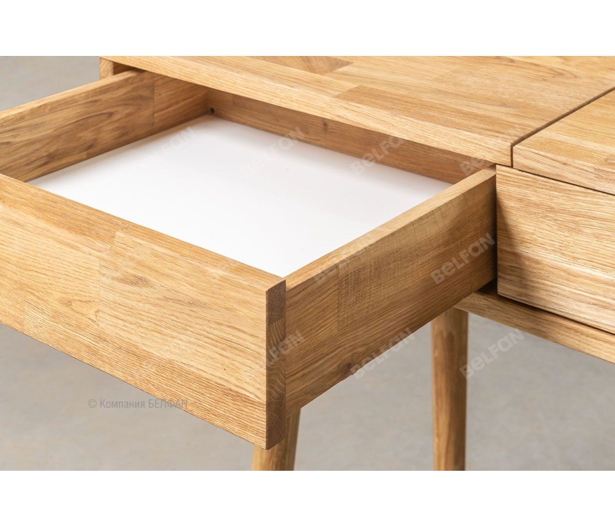 Коллекция мебели «Ирвинг» вдохновлена эстетикой Mid-century modern — это стиль лёгкости, порядка и изящных форм, в котором каждая линия оправдана, а каждая деталь продумана. Конструкции на тонких высоких ножках не загромождают пространство и создают ощущение воздушности, а текстурный дуб с тёплым крашением вносит в интерьер уют и благородство. Стол туалетный «Ирвинг» 2 — воплощение стиля, удобства и уважения к натуральным материалам. Скошенные к низу ножки придают визуальную лёгкость, корпус с чёткой геометрией смотрится изысканно и современно, ручки интегрированы в фасад — минималистично и удобно. Функциональные особенности ? Размеры: ширина 1400 мм, высота 750 мм, глубина 550 мм. ? По бокам - два выдвижных ящика обеспечивают удобное хранение косметики, аксессуаров и повседневных мелочей. ? Центральный отсек оснащён подъёмной крышкой с встроенным зеркалом и системой органайзеров — идеальное решение для украшений и косметики. ? Три варианта крашения: «бейц-масло», «графит» и «беленый дуб». Экологичность и материалы ? Стол изготовлен из массива дуба — прочного, долговечного и тактильно приятного материала. ? В качестве покрытия используется бейц-масло на натуральной основе, оно подчёркивает природный рисунок древесины и сохраняет её тактильную теплоту. В интерьере Идеально сочетается с кроватью, комодом и прикроватной тумбой из одноименной коллекции. Рекомендуем дополнить интерьер креслом с мягкой обивкой в приглушённых тонах и зеркалом в деревянной раме. Рекомендации по сочетанию: ? Сочетается с креслами и пуфами с мягкой текстильной или кожаной обивкой. ? Рядом можно поставить настольную лампу с матовым стеклом или керамической основой. Рекомендации от BELFAN: Мы рекомендуем воспользоваться услугой профессиональной сборки от BELFAN — чтобы сохранить гарантию и быть уверенными в точной установке всех элементов. Мебель из массива дерева необыкновенно красива, добротна и славится своим долголетием. Однако, чтобы продлить этот срок, сохранить мебельным изделиям первоначальную элегантность и отличный внешний вид, за ней необходим надлежащий уход. Если у вас появились царапины, следы от кружки или мокрой тряпки, то сервис-бокс от компании BELFAN поможет вам вернуть мебели первозданный вид даже в домашних условиях. Данный сервис-бокс подходит только для мебели в крашении бейц-масло.