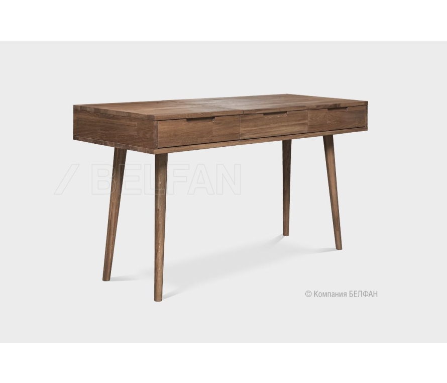 Коллекция мебели «Ирвинг» вдохновлена эстетикой Mid-century modern — это стиль лёгкости, порядка и изящных форм, в котором каждая линия оправдана, а каждая деталь продумана. Конструкции на тонких высоких ножках не загромождают пространство и создают ощущение воздушности, а текстурный дуб с тёплым крашением вносит в интерьер уют и благородство. Стол туалетный «Ирвинг» 2 — воплощение стиля, удобства и уважения к натуральным материалам. Скошенные к низу ножки придают визуальную лёгкость, корпус с чёткой геометрией смотрится изысканно и современно, ручки интегрированы в фасад — минималистично и удобно. Функциональные особенности ? Размеры: ширина 1400 мм, высота 750 мм, глубина 550 мм. ? По бокам - два выдвижных ящика обеспечивают удобное хранение косметики, аксессуаров и повседневных мелочей. ? Центральный отсек оснащён подъёмной крышкой с встроенным зеркалом и системой органайзеров — идеальное решение для украшений и косметики. ? Три варианта крашения: «бейц-масло», «графит» и «беленый дуб». Экологичность и материалы ? Стол изготовлен из массива дуба — прочного, долговечного и тактильно приятного материала. ? В качестве покрытия используется бейц-масло на натуральной основе, оно подчёркивает природный рисунок древесины и сохраняет её тактильную теплоту. В интерьере Идеально сочетается с кроватью, комодом и прикроватной тумбой из одноименной коллекции. Рекомендуем дополнить интерьер креслом с мягкой обивкой в приглушённых тонах и зеркалом в деревянной раме. Рекомендации по сочетанию: ? Сочетается с креслами и пуфами с мягкой текстильной или кожаной обивкой. ? Рядом можно поставить настольную лампу с матовым стеклом или керамической основой. Рекомендации от BELFAN: Мы рекомендуем воспользоваться услугой профессиональной сборки от BELFAN — чтобы сохранить гарантию и быть уверенными в точной установке всех элементов. Мебель из массива дерева необыкновенно красива, добротна и славится своим долголетием. Однако, чтобы продлить этот срок, сохранить мебельным изделиям первоначальную элегантность и отличный внешний вид, за ней необходим надлежащий уход. Если у вас появились царапины, следы от кружки или мокрой тряпки, то сервис-бокс от компании BELFAN поможет вам вернуть мебели первозданный вид даже в домашних условиях. Данный сервис-бокс подходит только для мебели в крашении бейц-масло.