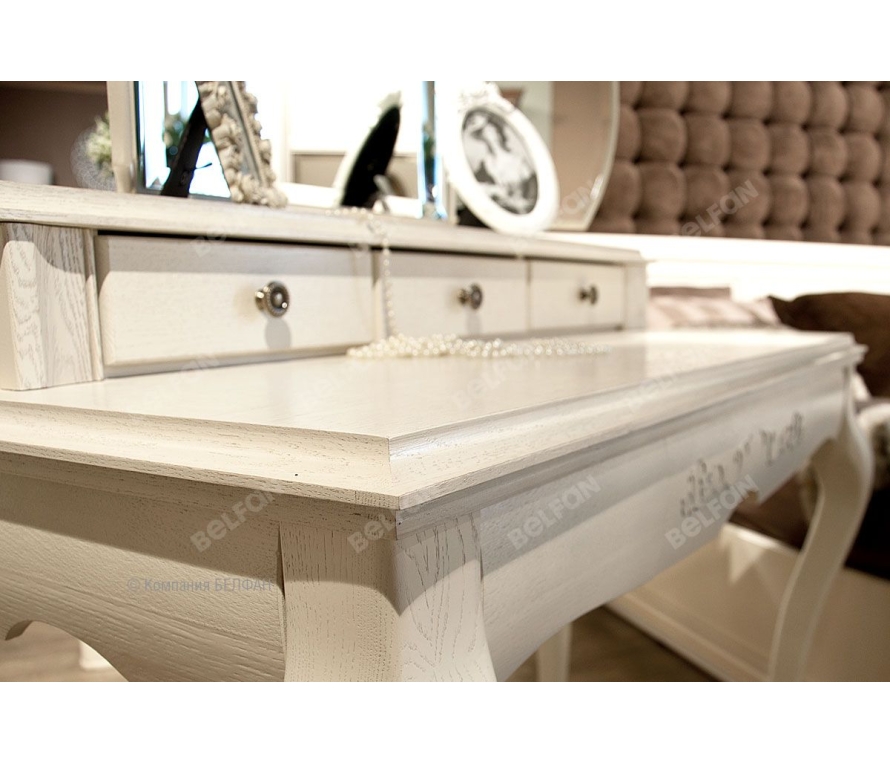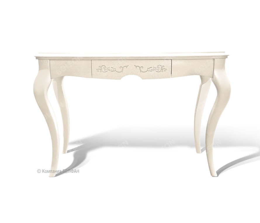Приятным дополнением к интерьеру спальни в классическом стиле может стать этот туалетный столик Sonata. Изогнутые ножки и объемный рисунок придется по вкусу даже самым привередливым покупательницам! Дополните его зеркалом – и он превратится в пикантный элемент декора, притягивая взгляды всех тех, кто будет заходить в комнату. Особенности туалетного стола «Соната» с декором (без надставки): ? Стол туалетный изготовлен из массива и шпона дуба. ? Изюминку дизайну стола туалетного придает оригинальный объемный рисунок в виде цветочного узора на фасаде ящика и фигурные ножки из массива дуба. ? Можно использовать как письменный стол или как небольшой стол для ноутбука. ? Для хранения косметики предусмотрен выдвижной ящик, дно которого выстлано мягчайшим велюром. Цвет ткани может разниться в зависимости от изделия. ? Глубина столешницы составляет 56 см, что позволит Вам максимально комфортно расположиться за туалетным столиком. ? Экологичное покрытие - окрашено краской и лаком на водной основе.
