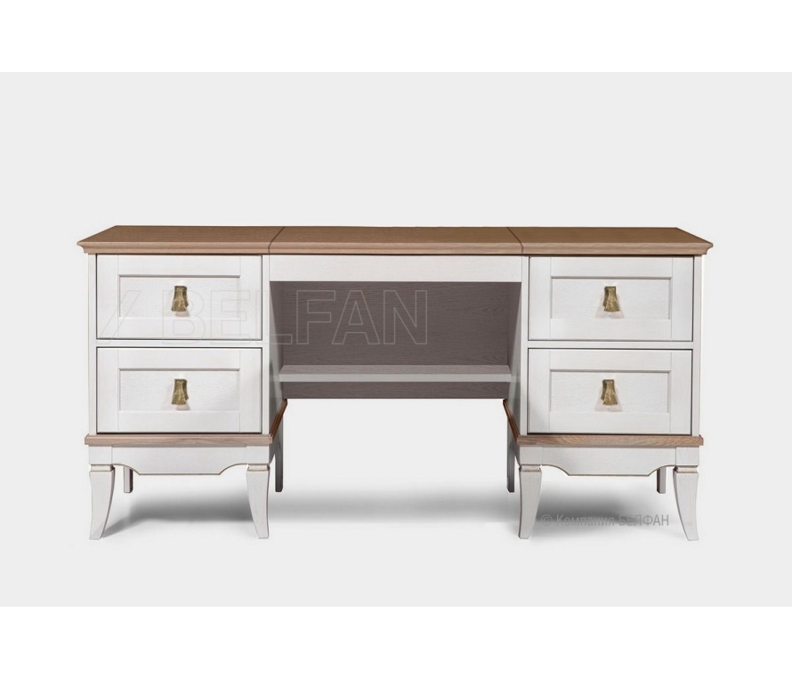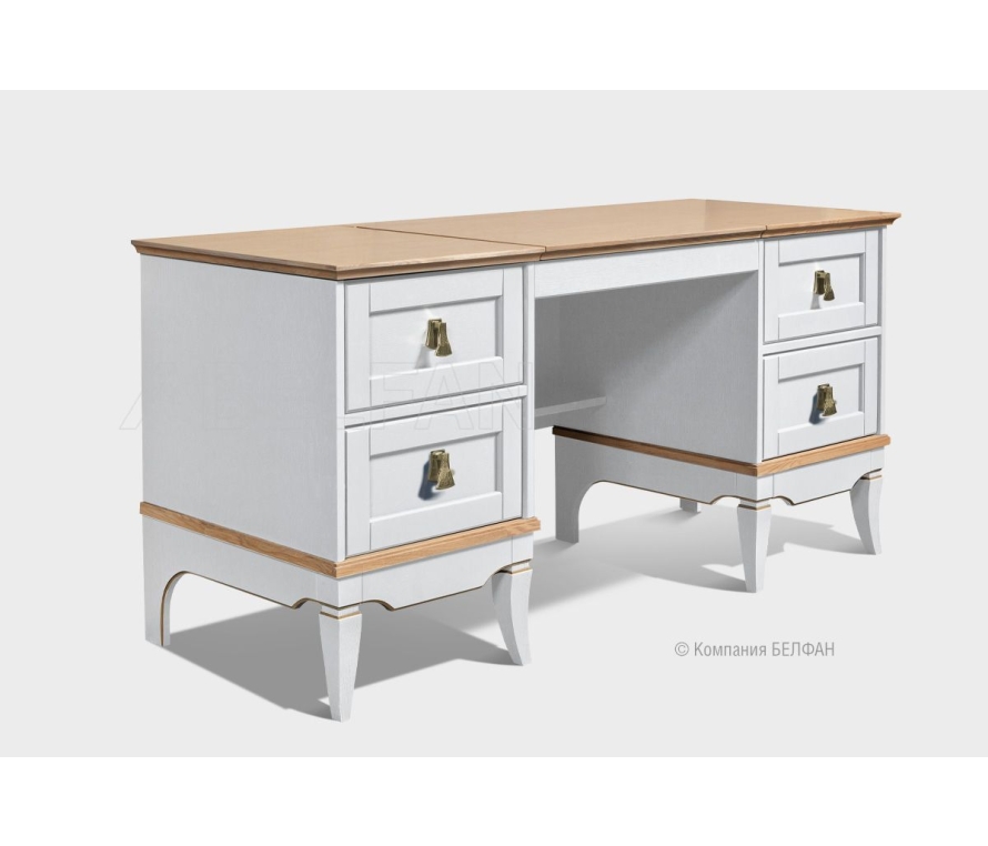 Стол туалетный с зеркалом и двумя тумбами «Стюарт» для Вашей спальни в классическом стиле Особенности туалетного стола «Стюарт»: ? Современный классический дизайн. ? Высокие резные ножки изделия с позолоченной фрезеровкой. ? Резные «юбки»-цоколи с позолоченной фрезеровкой. ? Эффектная лицевая фурнитура, выполненная в форме позолоченных кисточек, которая эффектно дополняет позолоченную фрезеровку на ножках и цоколях изделий. ? Сочетание глубоких матовых эмалевых крашений с глянцевыми элементами оттенка натурального дуба. ? Направляющие скрытого монтажа с доводчиками дают ежедневный комфорт использования ? В покрытии изделия используются краски и лаки на водной основе, что свидетельствует о безопасности и соответствует высоким стандартам качества. Схема стола туалетного с зеркалом: Схема стола туалетного: Примерьте туалетный стол «Стюарт» у себя дома! Пройдите по ссылке.