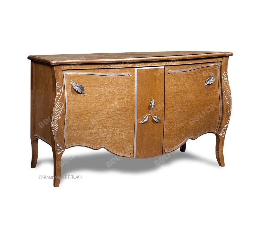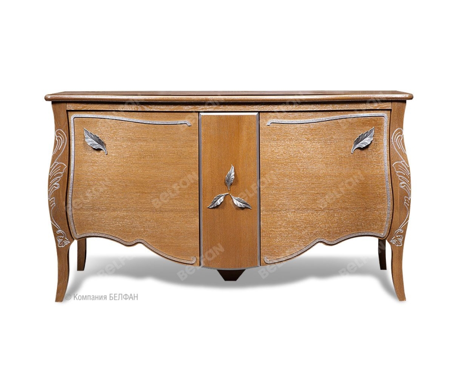 Особенности тумбы-бара «Трио»: ? Тумба изготовлена из массива и шпона дуба. ? Изюминку дизайну придает оригинальный выдвижной бар, встроенный в центральную часть тумбы. ? Бар - направляющие BLUM Tandem с доводчиком (пр-ва Австрии). ? Дверные петли с доводчиками Hettiche (пр-ва Германии) обеспечат плотное и бесшумное закрывание. ? Тумба украшена декоративной резьбой. ? Ручки Bosetti Marella (пр-ва Италии) в виде лепестков. ? Экологичное покрытие - окрашено краской и лаком на водной основе.