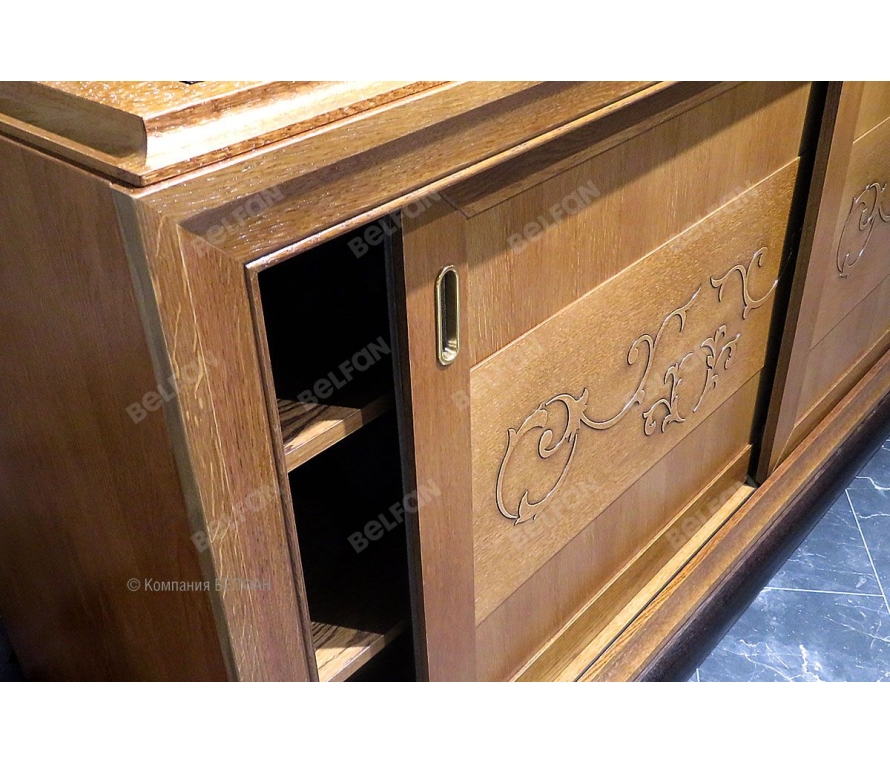 Роскошность и лаконичность прямых форм тумбы-купе «Соната» сочетается с классическими изогнутыми ножками. Этот великолепный и функциональный предмет интерьера станет неотъемлемой частью любой из Ваших комнат. Раздвижные двери с высококачественной фурнитурой, позволят использовать ее даже в небольших по площади помещениях. Благородные цвета «коньяк с темной патиной+ горький шоколад» и «белая эмаль с темной патиной» не оставят равнодушными любителей традиций и «размеренности». Особенности тумбы-купе "Соната" (декор): ? Тумба изготовлена из массива и шпона дуба. ? Изюминку дизайну тумбы придает оригинальный объемный рисунок в виде цветочного узора на фасаде. ? Две деревянные полки слева фиксированы, справа их можно регулировать для функционального использования. ? Высококачественная лицевая фурнитура Bosetti Marella (пр-ва Италии) ? Раздвижной механизм (пр-ва Дания) обеспечат плотное и надежное закрывание. ? Экологичное покрытие - окрашено краской и лаком на водной основе. Обратите внимание, что данная мебель коллекции Sonata является крупногабаритным неразборным изделием. При заносе в помещение, лифт, дверные проемы, лестницы на второй этаж и другие узкие места могут возникнуть сложности. Обязательно проконсультируйтесь с продавцом. Схема тумбы: