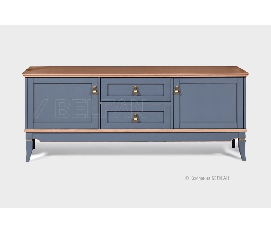 Особенности тумбы под ТВ «Стюарт»: ? Современный классический дизайн. ? Высокие резные ножки изделия с позолоченной фрезеровкой. ? Резные «юбки»-цоколи с позолоченной фрезеровкой. ? Эффектная лицевая фурнитура, выполненная в форме позолоченных кисточек, которая эффектно дополняет позолоченную фрезеровку на ножках и цоколях изделий. ? Сочетание глубоких матовых эмалевых крашений с глянцевыми элементами оттенка натурального дуба. ? Направляющие скрытого монтажа с доводчиками дают ежедневный комфорт использования