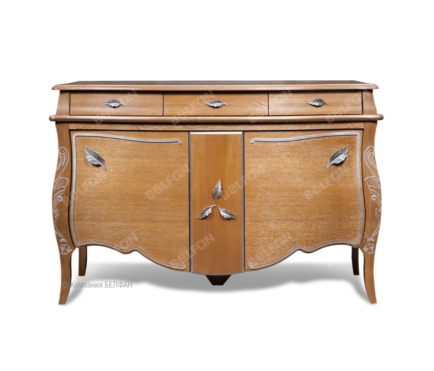 Выполненная из массива и шпона дуба тумба с баром из коллекции «Трио» станет отличным дополнением гостиной в классическом стиле. Декорированная резьбой и украшенная фурнитурой в виде лепестков, она обязательно будет приковывать к себе все взгляды. Классические оттенки «коньяк с серебряной патиной» и «белая эмаль с золотой или серебряной патиной» делает эту тумбу универсальным элементом интерьера. Особенности тумбы с баром «Трио»: ? Тумба изготовлена из массива и шпона дуба. ? Изюминку дизайну придает оригинальный выдвижной бар, встроенный в центральную часть тумбы. ? Бар - направляющие BLUM Tandem с доводчиком (пр-ва Австрии). ? Тумба оснащена выдвижными ящиками с качественными направляющими с доводчиками Blum (пр-ва Австрии) для плавного открывания и бесшумного закрывания. ? Дверные петли с доводчиками Hettiche (пр-ва Германии) обеспечат плотное и бесшумное закрывание. ? Тумба Trio украшена декоративной резьбой. ? Ручки Bosetti Marella (пр-ва Италии) в виде лепестков. ? Экологичное покрытие - окрашено краской и лаком на водной основе.