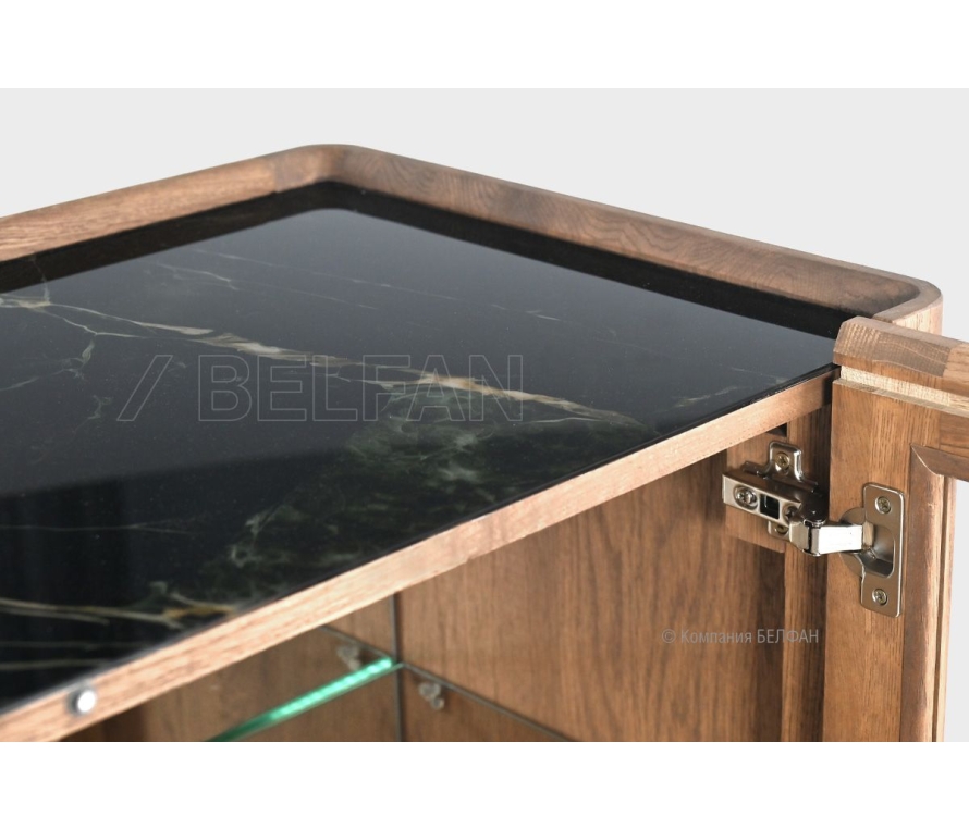 Особенности тумбы высокой «Bergamo» (Бергамо): ? Сочетание самых последних трендов современной мебельной моды. ? Мягкие плавные линии обраченные в минималистичность форм придадут интерьеру эстетичность. ? Высокие изящные ножки в сочетании с утопленными столешницами изделий создают эффект пространственной легкости. ? Цельные скруглённые стойки, переходящие в боковины, придают каждому изделию особое изящество, делая предметы цельными и утонченными. ? Яркий тренд мебельной моды – глянцевая стеклянная столешница с высочайшим качеством печати, имитирующая рисунок темного мрамора ? Сложная геометрическая фрезеровка на фасадах имитирует стекающую лаву, подчеркивая уникальность дизайнерской мысли. ? Яркий рисунок благородного дуба подчеркивает натуральность и индивидуальность изделия. ? 100% массив дуба. ? Изделия покрыты высокопрочным итальянским паркетным маслом «Borma». Покрытие позволяет подчеркнуть красоту натурального дуба, оно придает поверхности твердость, повышает водостойкость и износостойкость, изделие не темнеет со временем. Схема тумбы: