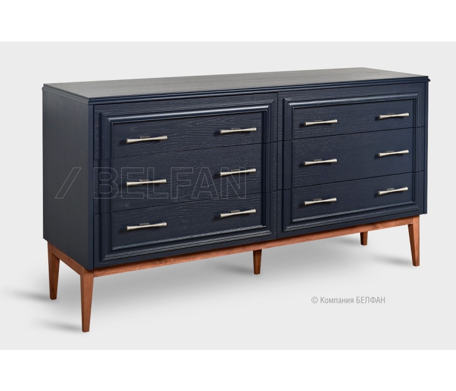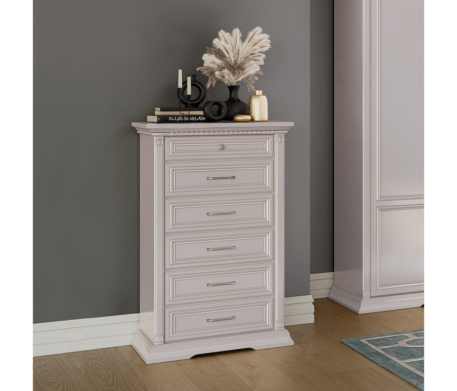 Цоколь, колонны, крышка и накладные профили передних стенок ящиков выполнены из массива дуба и облицованы шпоном ясеня. В отделке комода К-6 используются резные декоративные элементы. Изделие имеет шесть выдвижных ящичков, в которых вы с легкостью сможете разместить большое количество необходимых вещей. Ящик оснащены качественной бесшумной системой доводки. Габаритный размер указан по максимально выступающим частям изделия.