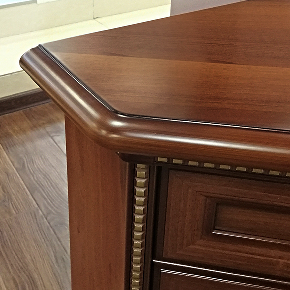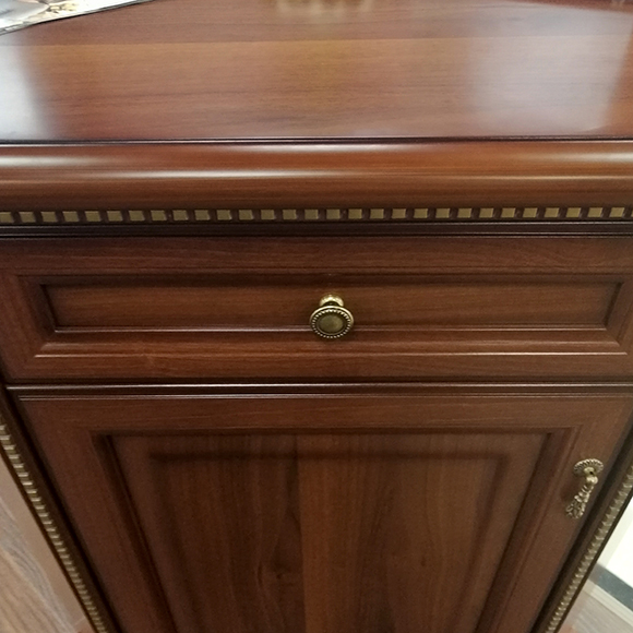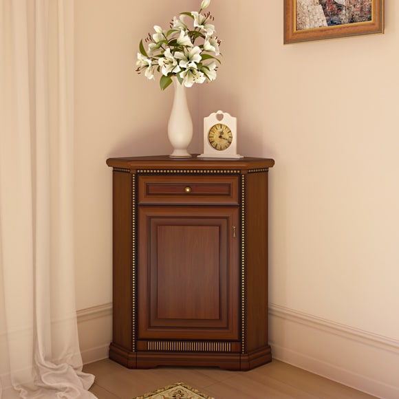 Компактный угловой комод дополнит интерьер гостиной комнаты. В отделке используются классические позолоченные декоративные элементы, патина.Габаритный размер указан по максимально выступающим частям изделия. Размер вдоль стен: 559 мм.