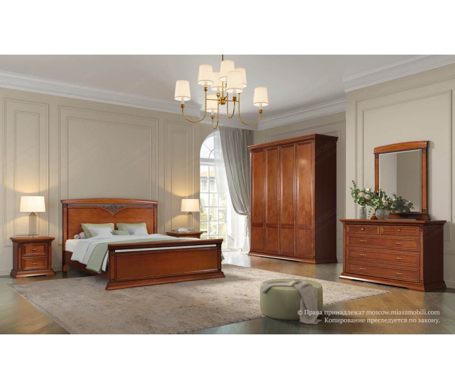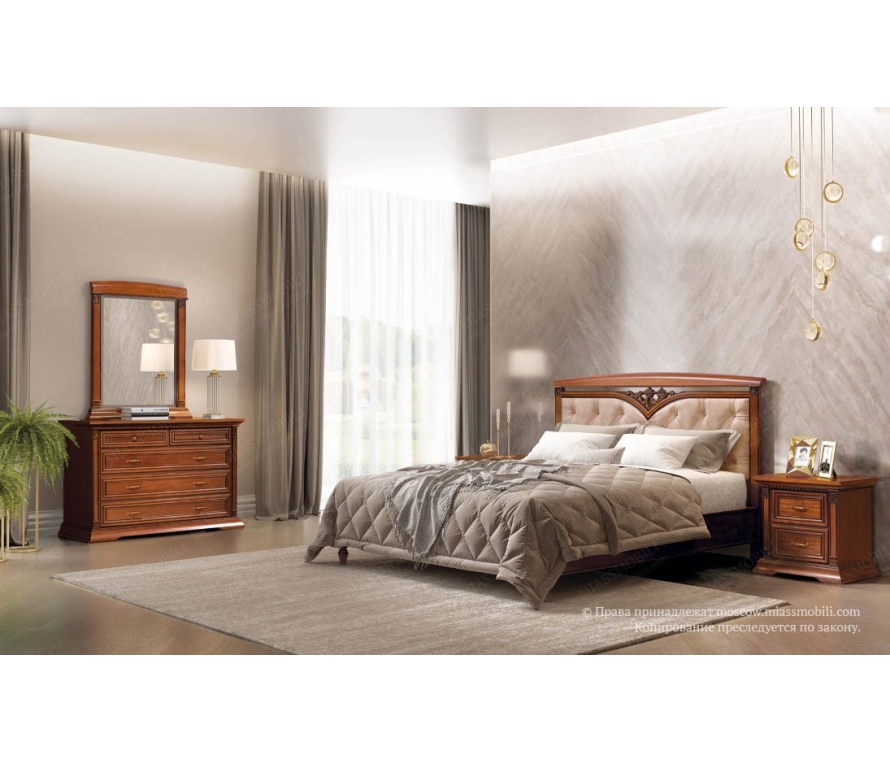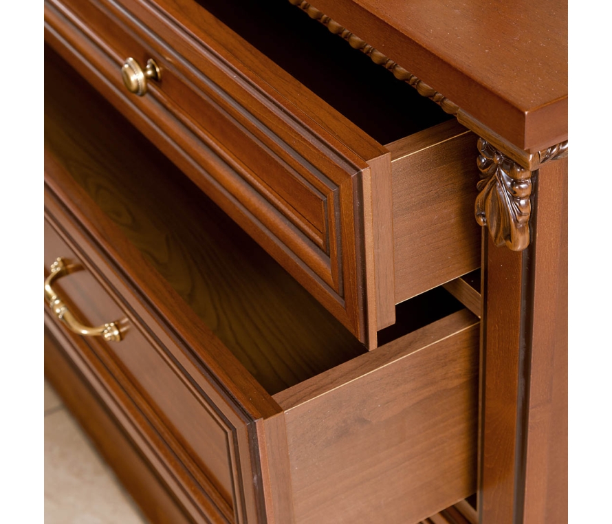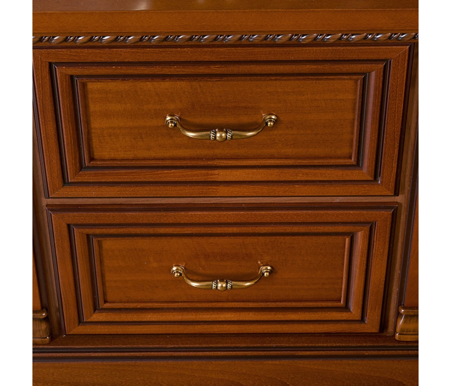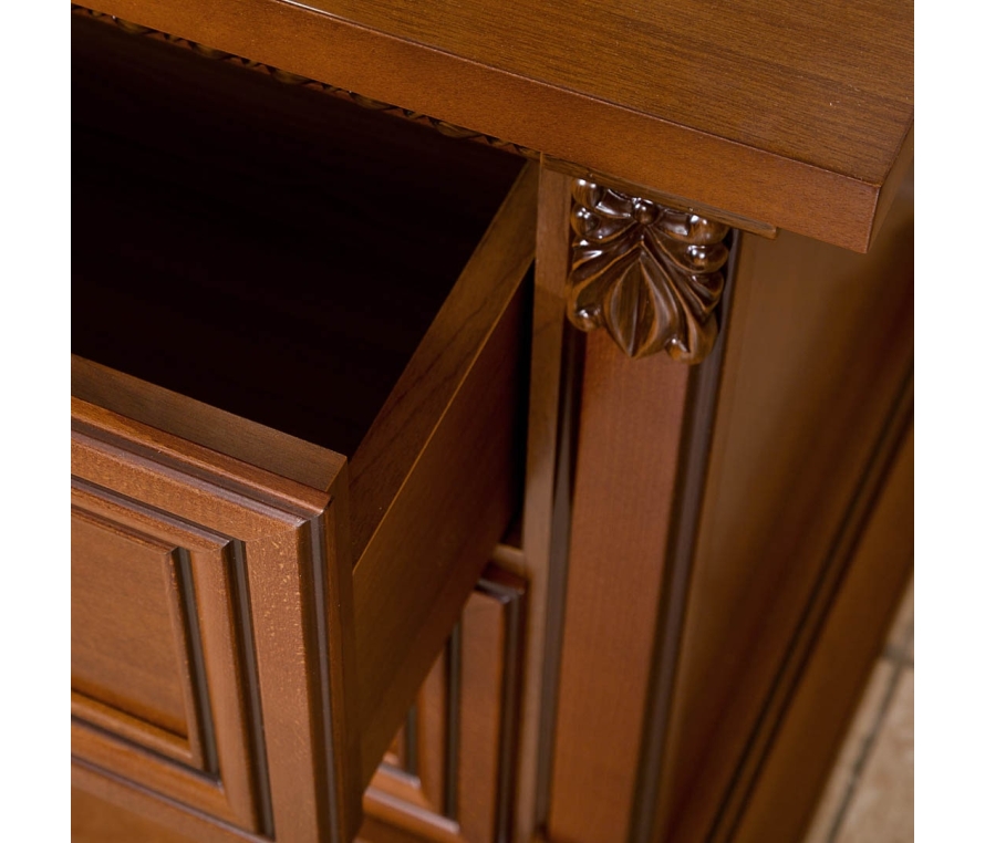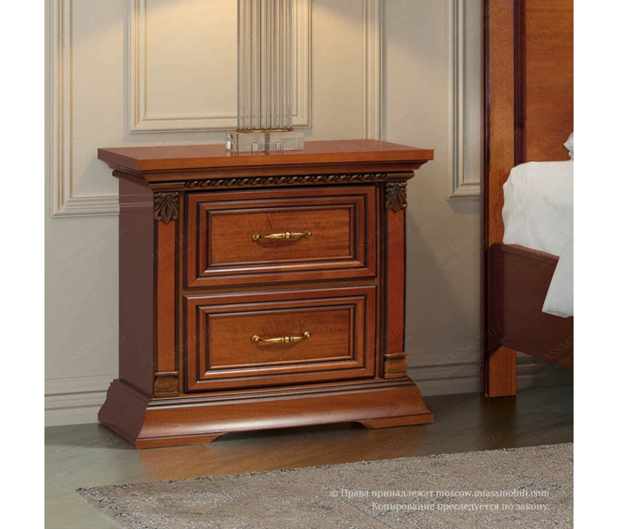 Прекрасным обрамлением кровати служат прикроватные тумбы. Тумба имеет два небольших выдвижных ящика с качественной системой бесшумного закрывания - доводкой. Цоколи, бруски крышки, колонны и накладные профили передних стенок ящиков выполнены из массива бука, крышка и лицевые щитовые детали облицованы шпоном красного дерева. Резные элементы придают образу тумбы статусность и благородство. Стильные ручки дополнят привлекательный образ миниатюрной тумбы.