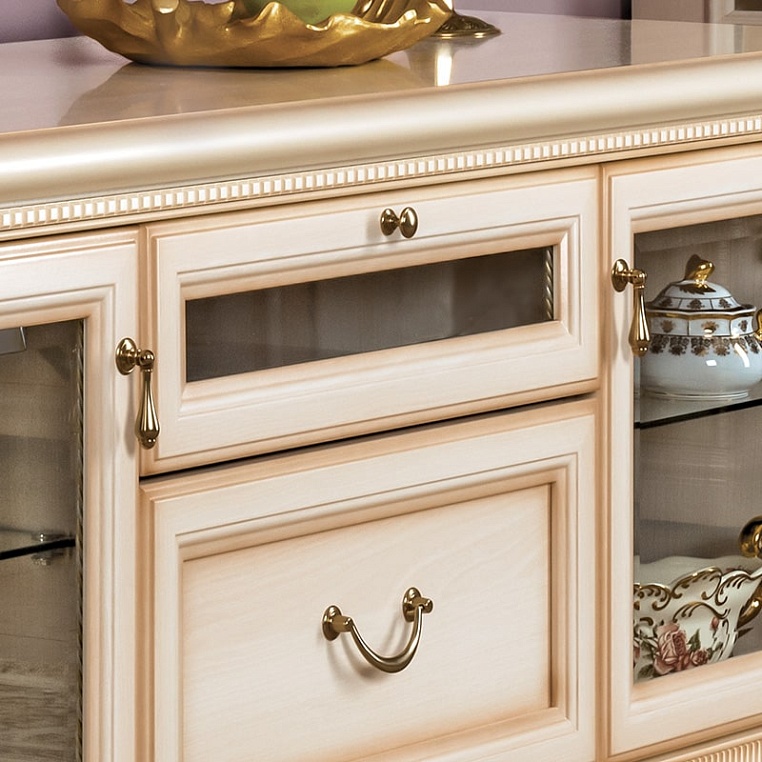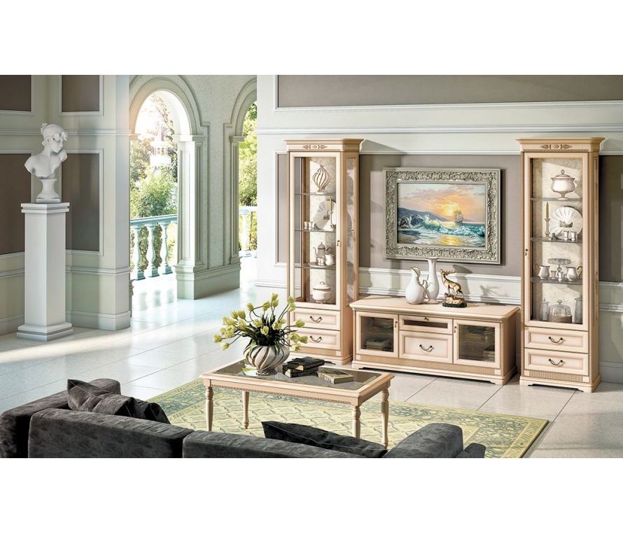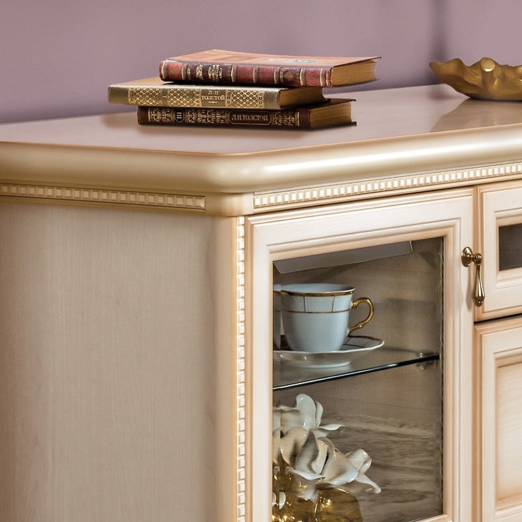 Тумба для телеаудиоаппаратуры обустроена множеством отделений со стеклянными полочками и дверками для хранения книг, дисков и много другого. Тумба изготовлена в кремовом цвете с отделкой патиной. Фасад изделия декорирован накладными резными элементами. Составить гармоничный ансамбль для гостиной вам помогут другие элементы, входящие в коллекцию. Габаритный размер указан по максимально выступающим частям изделия.
