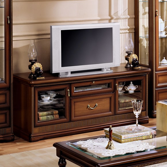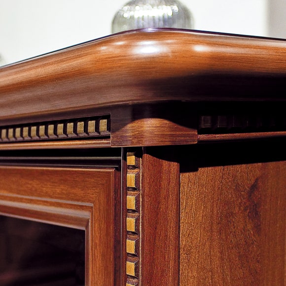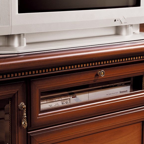 Тумба для телеаудиоаппаратуры обустроена множеством отделений со стеклянными полочками и дверками для хранения книг, дисков и много другого. Теплый ореховый цвет тумбы подчеркивает благородная патина. Фасад изделия декорирован накладными резными элементами. В сочетании с однодверными витринами тумба для телеаудиаппаратуры образует гармоничный ансамбль. Габаритный размер указан по максимально выступающим частям изделия.