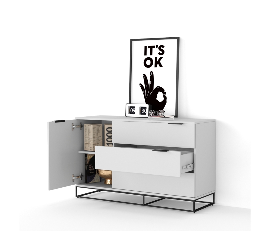 Буфет City станет украшением вашей гостиной. Ножки буфета выполнены из металлического профиля с черным порошковым покрытием. Прочный и минималистичный корпус выполнен из ЛДСП в белом цвете.