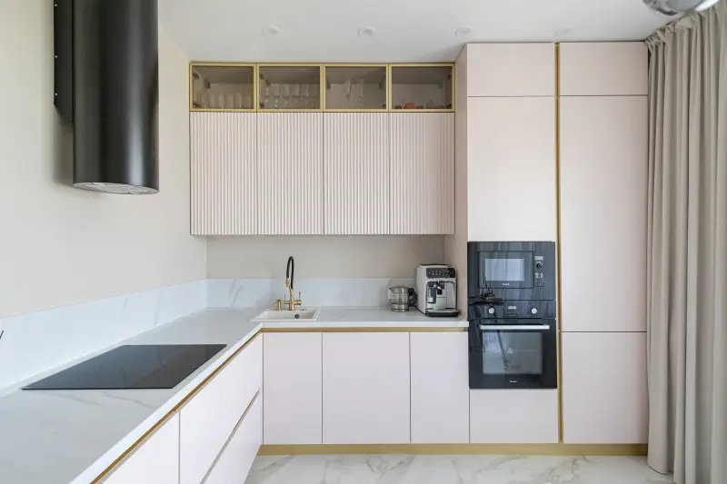 Кухня ЛАВТЭ3030\Slide-S01 NCS S 1005-Y80R/Slide-S02 NCS S 1005-Y80R — это сочетание современного дизайна и продуманной функциональности. Основные характеристики: - Материалы: Угловая кухня выполнена из стекла, алюминия и эмали, что обеспечивает стильный внешний вид и долговечность. - Форма: Г-образная, идеально подходит для оптимального использования пространства. - Стиль: Современный и модерн, выделяется элегантной лаконичностью. - Цвет: Матовый, светлый с нежными розовыми оттенками и золотыми акцентами добавляет роскошь и теплоту. - Размер: Большая кухня длиной 3,3 м, достаточная для помещений площадью 15 кв.м. - Столешница: Изготовлена из искусственного камня и акрила для повышенной износостойкости. Комплектация: - Встроенная корпусная мебель. - Пенал для хранения и витрина для посуды. - Духовка, техника, включая посудомоечную машину. - Отсутствие ручек на фасадах обеспечивает минималистичный дизайн. Назначение: Универсальна для городской квартиры, частного дома или дачи, а также подойдет как элемент открытой кухни-гостиной. Это решение для ценителей утонченного стиля и удобства. Кухня сочетает высокую функциональность с элегантным внешним видом, идеально дополняя современный интерьер.