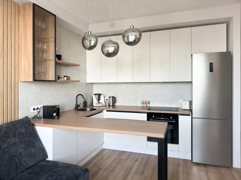 Кухня ЛИМ800 / Суперматовый Белый Blanco Supramat Эта стильная и эргономичная кухня идеально подходит для современного дома, в котором ценят комфорт, стиль и функциональность. Особенности: - Материалы: Выполнена из современных и качественных материалов — стекло, пластик и алюминий, что обеспечивает её долговечность и легкость в уходе. - Форма: Оптимальная П-образная форма для удобной организации рабочего пространства. Актуальные барные элементы добавят утонченности и функциональности. - Цвет: Элегантный матовый белый цвет в сочетании с акцентами "под дерево" создаёт уютную и модную атмосферу. - Размер: Подходит для помещений площадью до 15 кв.м. и длиной до 3 м, гармонично дополняя как большие, так и небольшие пространства. - Стиль: Лофт, минимализм, скандинавский стиль или модерн — эта кухня станет украшением любого интерьера. Комплектация: - Барная стойка с качественной HPL-столешницей (Egger). - Встроенные шкафы и витрина. - Встроенная техника: варочная панель, духовой шкаф, холодильник. - Удобная мойка для повседневного использования. - Конструкция без ручек для максимальной простоты и лаконичности. Назначение: Идеальный выбор для гостиной, квартиры-студии или загородного дома. Эта кухня создаст ощущение легкости и гармонии, при этом предоставит максимум удобства для приготовления пищи и отдыха в кругу семьи или гостей.