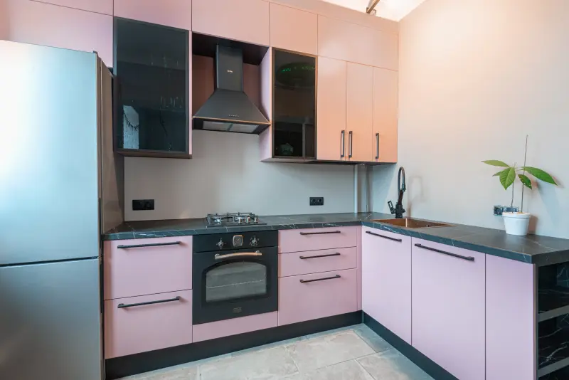 Кухонный гарнитур ЛКМЭ112/МДФ Краска Slide S-01 (система) Мат/Z-1 KNK Коньяк Элегантная и современная кухня, выполненная в стиле модерн, станет идеальным решением для вашего дома, квартиры или дачи. Гарнитур изготовлен из высококачественных материалов: эмали, алюминия и стекла, что гарантирует долговечность и удобство в использовании. Основные характеристики: - Форма: Г-образная, угловая – обеспечивает компактное расположение и эргономичность. - Размеры: Небольшой гарнитур длиной 2 метра, рассчитанный на площадь 10 кв. м. - Цвет: Розовый матовый – придает кухне яркость и стильный акцент. - Комплектация: Включает всё необходимое: духовка, мойка, вытяжка и столешница из стойкого пластика (Эггер, HPL). - Назначение: Подходит как для студии или гостиной, так и для дачи или частного дома. Кухня продуманно оформлена для удобного размещения кухонной техники и аксессуаров. Тёмная столешница из прочного материала гармонично сочетается с розовыми фасадами, создавая современный и уютный вид. Кухонный гарнитур ЛКМЭ112/МДФ Краска Slide S-01 – это не только стильный дизайнерский элемент, но и практичное решение для комфортной готовки и хранения.