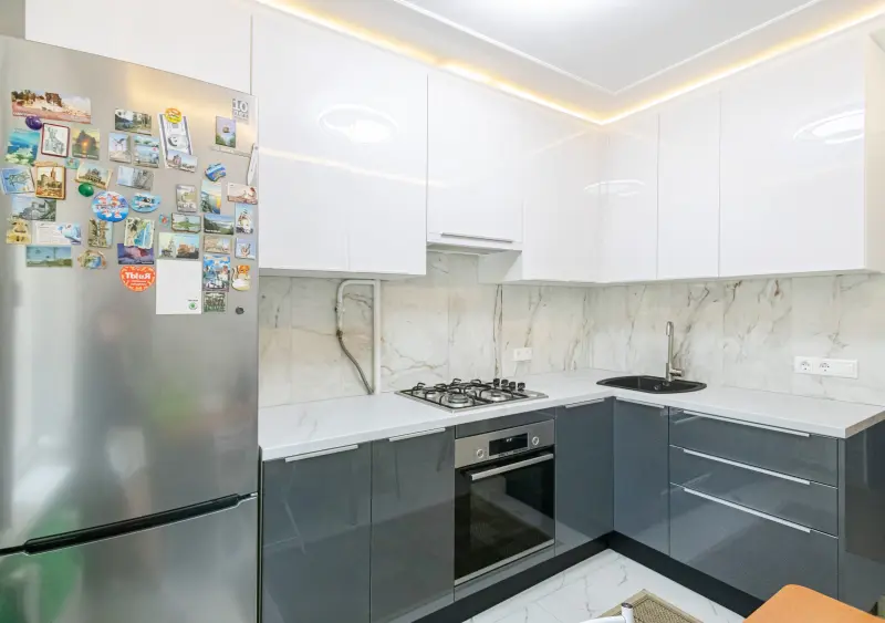 Угловая кухня «ЛКОТ4 АКРИЛ В16 Белый металлик/B18 Асфальт металлик» — современное решение для небольших помещений, объединяющее стиль, функциональность и элегантность. Основные характеристики: - Материал: Акрил, придающий поверхности изысканный глянцевый блеск. - Форма: Г-образная компоновка идеально подойдет для экономии пространства. - Стиль: Современный минимализм с элементами скандинавского дизайна. Лаконичные линии подчеркивают актуальность и утонченность. - Цветовая палитра: Светлый белый металлик в сочетании с темно-серым асфальтовым металликом создают контраст и добавляют кухне глубину и динамику. - Размер: Компактные габариты длиной 2,2 м оптимально подходят для помещений площадью до 8 кв. м. - Столешница: Выполнена из долговечного и практичного искусственного камня с акриловым покрытием. Комплектация: - Встроенная корпусная мебель, создающая единое стильное пространство. - Удобная мойка с качественным смесителем. - Газовая плита, духовка и вытяжка легко интегрируются в дизайн. - Продуманная система хранения за счет вместительных верхних и нижних шкафов. Идеально подходит: - Для квартир-студий, современных домов и небольших гостиных. - Для тех, кто ценит качество, стиль и функциональность в одном решении. Кухня создана для комфортного приготовления блюд и поддержания порядка в доме. Ее элегантность и практичность сделают вашу комнату центром притяжения для семьи и гостей.