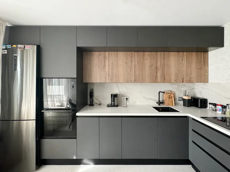 Кухня ЛКП286 "Пост ТИМБЕР Рока/Пост AGT супрамат 3023 DOLPHIN GREY" — это стильное и практичное решение для современных интерьеров. Выполненная в Г-образной форме, она органично впишется в пространство больших помещений площадью 12 кв.м. Модель сочетает в себе материалы высокого качества: пластиковые фасады в безупречном матовом сером цвете Dolphin Grey, покрытие из пленки "под дерево", и долговечную столешницу из искусственного камня акрила. Это гармоничное сочетание подчеркивает современный стиль, идеально подходящий для дизайнов в направлении лофт, модерн и минимализм. Кухня оборудована корпусной мебелью без ручек с доводчиками, что обеспечивает комфорт и эстетическое удобство. Эргономичная конструкция позволяет оптимально использовать каждый метр пространства, создавая функциональную рабочую зону. Встроенная техника легко интегрируется, сохраняя целостный внешний вид. Идеальное решение как для квартиры-студии, так и для дома или гостиной. Длина всей конструкции составляет 3,6 м, что позволяет разместить все необходимое для максимально комфортного использования. Преимущества модели: - Эстетика благодаря комбинации матового серого цвета и текстуры дерева. - Удобство эксплуатации благодаря доводчикам и отсутствию ручек. - Высокое качество материалов: ЛДСП и пленочные покрытия сохранят свой вид долгие годы. - Просторная столешница из акрилового камня для удобной работы на кухне. Эта кухня станет гармоничной частью вашего интерьера, совмещая в себе стиль, комфорт и функциональность!