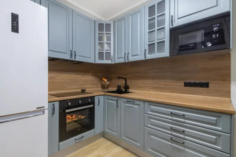 Угловая кухня ЛЛХ163/МДФ-1 Палас Фьорд Элегантная кухонная композиция в стиле прованс и современной классики станет идеальным решением для вашего дома, квартиры или дачи. Лаконичная Г-образная форма впишется в помещение площадью 10 кв. м., создавая уютное и функциональное пространство для приготовления пищи и отдыха. Основные особенности и характеристики модели: - Материалы: Фасады выполнены из МДФ с покрытием пленкой. Витрины со стеклом добавляют легкости дизайну. - Стиль и цвет: Благородная матовая поверхность в холодном голубом оттенке с элементами «под дерево» гармонично сочетается с деревянной столешницей, создавая атмосферу тепла и уюта. - Размещение: Угловая конструкция длиной 2,5 м идеально подходит для небольших помещений, обеспечивая каждую зону функциональностью. - Комплектация: - Столешница из прочного пластика HPL от бренда Egger, устойчива к влаге и механическим повреждениям. - Фартук «под дерево» поддерживает общий стиль оформления. - Надежные доводчики обеспечивают плавное закрывание ящиков и дверей. - Встроенная корпусная мебель экономит пространство. - Витрина придает дизайну утонченность и лёгкость. Эта кухня станет отличным выбором для тех, кто ценит сочетание стиля, эргономичности и долговечности.