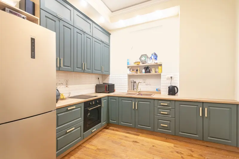 Кухня ЛЛЮБ1230/МДФ ПВХ Волна Лонгфорд ХАЙЛЕНД ГРИН Эта элегантная кухня сочетает в себе комфорт, стиль и практичность, делая её идеальным выбором для дома, квартиры или загородной дачи. Основные характеристики: - Материал: Корпус выполнен из качественного МДФ, покрыт устойчивой ПВХ-пленкой, не теряющей презентабельный вид со временем. - Форма: Г-образная (угловая), идеально подходит для оптимального использования пространства. - Размер: Компактная длина модулей 2,7 м и площадь 12 кв. м позволяют создать удобную рабочую зону для приготовления пищи. - Цветовое решение: Матовый темно-зеленый оттенок с текстурой "под дерево", подчеркивающий изысканность и уют в любом интерьере. - Стиль: Разработана в переходе классических и современных направлений — Прованс, Кантри, Деревенский стиль, Современная и Неоклассика. Дополнительные особенности: - Комплектация: В комплект входит высоконадежная пластиковая столешница (Egger, HPL) и практичная встроенная мойка. - Функциональность: Качественная фурнитура и достаточное количество полок и шкафов обеспечивают удобство хранения. - Назначение: Универсальный вариант как для городской квартиры, так и для загородного дома. Эта кухня станет стильным и удобным акцентом вашего интерьера, гармонично сочетая эстетику и практичность.