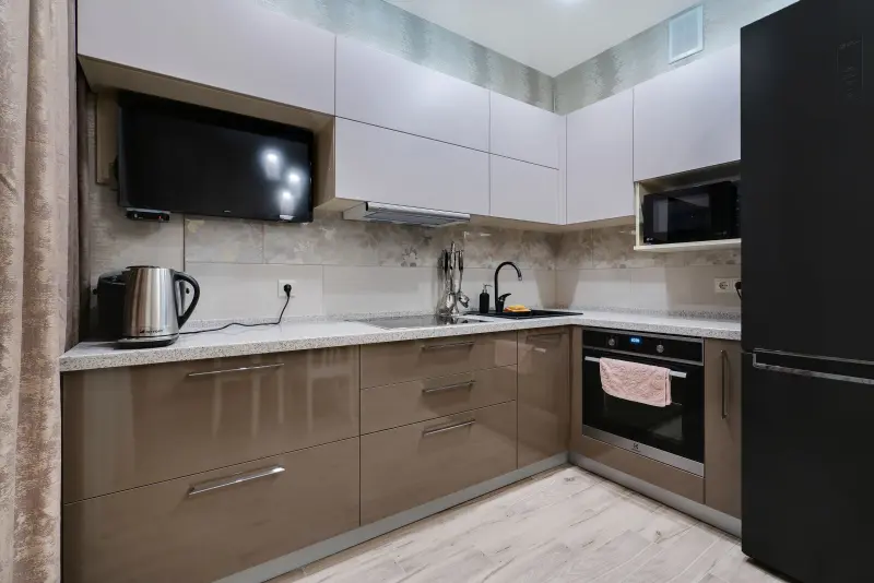 Кухня ЛЛЮБ140 / Система Сатин Бежевый / Пост 5 Земляной Функциональная и стильная Г-образная кухня, выполненная в современном модерн-стиле, станет идеальным дополнением вашего дома, квартиры или студии. Компактная площадь (8 кв.м) и длина 2,6 м создают оптимальную конфигурацию для небольших пространств, обеспечивая удобство использования и эргономичность. Особенности: - Материалы: Корпус и фасады изготовлены из высококачественной пленки и пластика, которые устойчивы к износу и легко поддаются уходу. - Цветовая гамма: Сочетание нежных сатиновых, кофейных и шоколадно-матовых оттенков с глянцевыми элементами придаёт кухне утончённость и современный характер. - Комплектация: Включает встроенную духовку, моечную секцию, функциональные шкафы с доводчиками для плавного закрывания и долговечную столешницу из искусственного камня (акрил), которая устойчива к механическим повреждениям и влаге. - Форма и назначение: Угловая конструкция идеально подойдёт для размещения в домах, студиях, гостиной или даже на даче, экономя пространство и предоставляя достаточную площадь для готовки. Удобство и практичность: Эта кухня разработана с учетом превосходной эргономики и современных требований. Светлые верхние шкафы визуально увеличивают пространство, а тёмные нижние элементы добавляют глубины. Большое количество мест для хранения позволяет хранить все необходимые кухонные принадлежности. Кухня ЛЛЮБ140 — это гармоничное сочетание эстетики, практичности и современных технологий, которые делают процесс готовки комфортным и приятным!