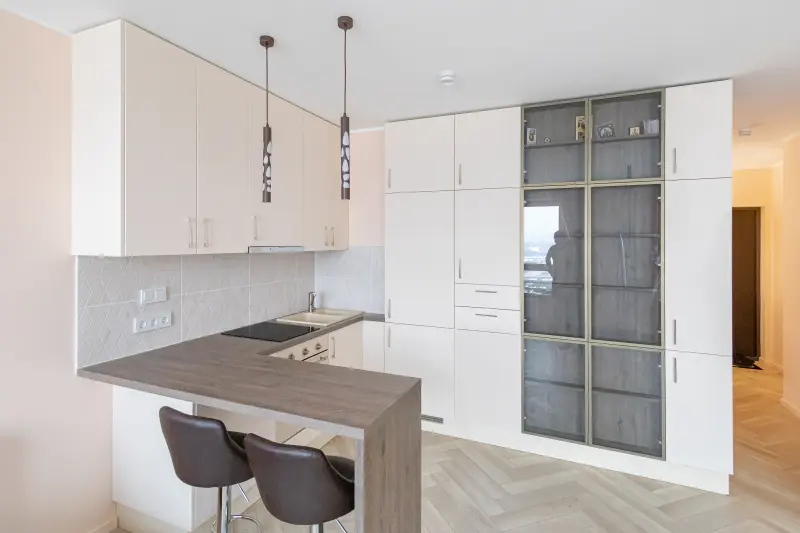 Кухня ЛЛЮБЭ1215 Слайд -01 SM2 выполнена в суперматовом покрытии цвета ваниль, что придаёт интерьеру элегантность и светлую, лёгкую атмосферу. Этот гарнитур идеально подойдёт для современного студийного помещения, объединяя стиль, функциональность и эргономику. Характеристики и преимущества: - Материалы: Фасады из пленки ПВХ на основе прочного материала, витрины со стеклом и алюминиевыми рамками обеспечивают долговечность и простоту ухода. - Форма: Г-образная угловая конструкция удобна для компактного использования пространства. - Цветовая палитра: Светлый оттенок слоновой кости в матовом исполнении создаёт стильный акцент и визуально расширяет пространство. - Комплектация: Включает барную стойку, вместительный пенал, столешницу из качественного пластика (HPL от Egger), духовой шкаф и витрину. - Размеры: Общая длина – 3 метра, рассчитана на площадь кухни до 15 кв.м. - Стиль: Гарнитур выполнен в трендовых стилях модерн и лофт, благодаря чему станет гармоничным компонентом современного интерьера. Кухня также оснащена продуманным набором мест хранения, предоставляя достаточно пространства для бытовой утвари и другой кухонной техники. Барная стойка добавляет удобства для быстрых перекусов или уютных вечеров. Кухня ЛЛЮБЭ1215 Слайд -01 SM2 — это безупречное сочетание изящного дизайна и высокой функциональности для вашего дома.