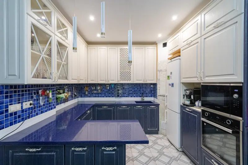 Кухня ЛЛЮБЭ1247\MDP20 Дуб Снежный Патина Серебро Сплошной / Дуб Королевский Патина Серебро Сплошной Элегантная кухня, созданная для ценителей изысканного стиля и функциональности. Модель выполнена в премиальном дизайне, сочетающем элементы классики, неоклассики и современной классики. Светлые оттенки "Дуб Снежный" с патиной серебряного цвета дополняются глубоким темно-синим "Дубом Королевским". Матовый финиш дарит ощущение уюта и гармонии. Основные характеристики: - Форма: П-образная с барной стойкой, идеально подходящей для просторных помещений. - Габариты: Длина 5 метров, площадь - 18 кв.м, предусмотрено компактное размещение бытовой техники и системы хранения. - Материалы: Фасады из пленочного покрытия и стеклянные витрины подчеркивают стильный облик. - Столешница: Искусственный камень или акрил, прочный и практичный в уходе. - Цветовая палитра: В сочетании светлых и темных оттенков матовой текстуры создается благородный контраст. Комплектация: - С доводчиками для плавного закрывания дверей. - Встроенные пеналы и корпусная мебель с продуманной организацией. - Установлены посудомоечная машина и мойка. - Элегантные стеклянные витрины для хранения посуды или декора. - Прочная и стильная барная стойка добавляет функциональности и завершает композицию. Назначение: - Решение премиум-класса для квартир с большим кухонным пространством. Лаконичный и изысканный дизайн украсит любые современные интерьеры. Кухня ЛЛЮБЭ1247 – это высокий стандарт качества, гармония стиля и эргономичность в каждой детали.