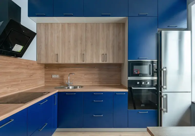 Кухня ЛММ138\ПОСТ ТИМБЕР САБИА / RAL матовый ZOV 224 Эта стильная угловая кухня идеально сочетает современный дизайн и функциональность. Выполненная в стиле лофт, минимализм и скандинавском направлении, она создаёт уютную и гармоничную атмосферу в вашем доме. Характеристики: - Материал: Пластик, эмаль, стойкий к механическим повреждениям. - Форма: Г-образная, что обеспечивает эргономичное использование пространства. - Цвет: Сочетание глубокого матового синего и текстуры "под дерево" (Тимбер Сабиа). - Размер: Подходит для просторных помещений, длина 2,6 м, площадь кухни – 10 кв. м. - Комплектация: - Духовой шкаф и варочная панель. - Пенал для хранения. - Практичные доводчики для мягкого закрывания ящиков. - Фартук и столешница из HPL и пластика (Egger). - Встроенная корпусная мебель. Назначение: Подходит для квартир, студий, домов, дач или гостиных. Эта кухня успешно сочетает эстетику и функциональность, делая её универсальным решением для любого помещения. Будьте уверены, что эта кухня станет центром вашего жизненного пространства, подчёркивая ваш вкус и современный стиль.