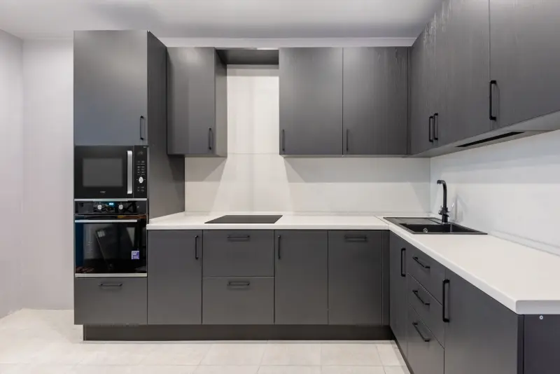 Фасад: МДФ система Ясень графитСтолешница: Агриллит белый 38ммКорпус: Графит 18мм