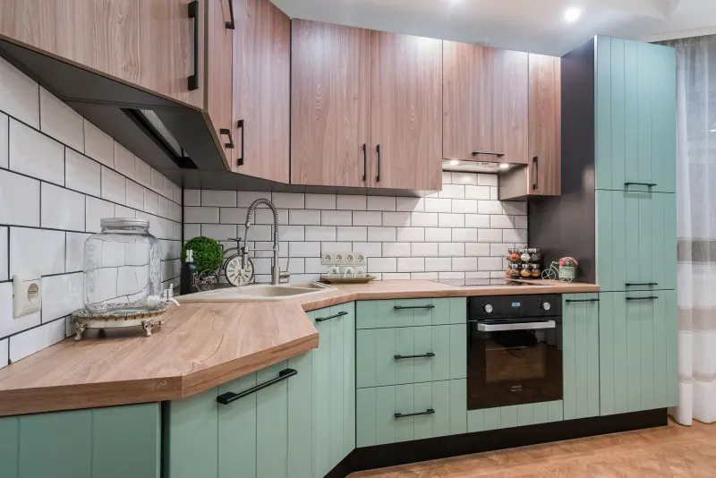 Кухня ЛРАЙ132/ЛДСП Вяз Коричневый/Линнеа Мятный СофтТач Элегантная и функциональная угловая кухня, выполненная в стиле лофт и модерн, станет идеальным выбором для дома, квартиры или дачи. Компактное решение для небольших помещений (10 кв.м) с длиной кухонного гарнитура 2,4 м. Особенности и преимущества: - Эстетика и стиль: Современное сочетание светлого дерева "Вяз Коричневый" и матового мятного оттенка "Линнеа" придаёт кухне уют и уникальность. - Материалы: Надёжные и долговечные материалы – ЛДСП с покрытием плёнкой и пластиковая столешница серии HPL (Egger). - Функциональность: - Угловая рабочая зона с удобной мойкой, экономящая место. - Встроенные шкафы для организованного хранения. - Пенал и духовка, гармонично встроенные в гарнитур. - Вытяжка скрыта в дизайне для современного минимализма. - Удобство материалов: Простота в уходе благодаря матовой поверхности с эффектом SoftTouch. Кухня подходит для использования в гостиной или кухонной зоне: компактная и стильная, она создаёт атмосферу уюта и функциональности.