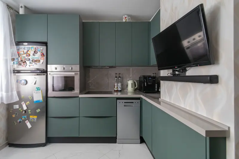Кухня ЛРАЙ501/ПВХ Хайленд грин Современная и стильная кухня ЛРАЙ501/ПВХ Хайленд грин станет изысканным акцентом вашего интерьера. Выполненная в элегантном матовом тёмно-зелёном цвете, она гармонично впишется в минималистичный, скандинавский или модерновый стиль. Основные характеристики: - Материал фасадов: Плёнка ПВХ, устойчивая к загрязнениям и влаге. - Форма: Г-образная угловая конструкция, идеально подходит для экономии пространства. - Размеры: Небольшая и компактная кухня длиной 2,7 м, рассчитанная на помещение площадью около 10 кв.м. - Столешница: Искусственный камень (акрил) для высокого уровня прочности и износостойкости. - Комплектация: - Встроенная корпусная мебель. - Варочная панель и духовка. - Вытяжка, мойка и посудомоечная машина. - Практичный пенал для хранения. - Система доводчиков обеспечивает плавное и бесшумное закрытие ящиков. - Назначение: Подходит для дома, квартиры, студии, офиса или дачи. Сочетание функциональности и эстетики делает эту кухню практичным и стильным решением для любых задач. Эргономичный дизайн и встроенная техника помогают создавать комфортную атмосферу для готовки и общения.