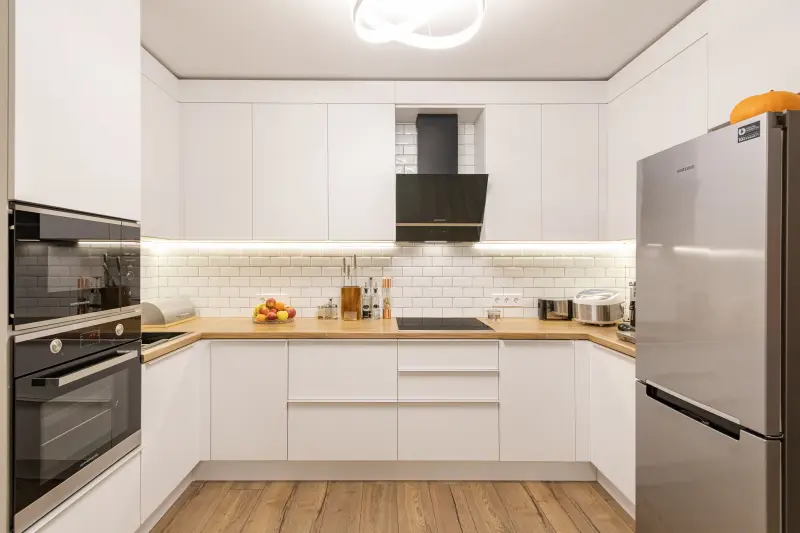 Элегантная и функциональная кухня ЛРАЙ521/ПВХ Белый супермат – идеальное решение для современных интерьеров. Удобная П-образная форма кухни позволяет рационально использовать пространство площадью 18 м-, обеспечивая комфорт и эргономичность. Модель выполнена в эстетике современного стиля, которая гармонично сочетается с элементами минимализма, скандинавского дизайна и даже деревенского уюта. Основные характеристики: - Материал фасадов: Пленка, устойчивая к износу и легкая в уходе. - Цвет: Светлый матовый белый с элементами "под дерево", создающий уютную атмосферу. - Размер: Длина 3,3 м, идеально подходит для средних и больших помещений. - Столешница: Практичный пластик HPL марки Egger, устойчивый к повреждениям и воздействию влаги. - Комплектация: Включает всё необходимое: вытяжку, варочную панель, духовку, мойку, встроенную корпусную мебель и просторный пенал. Все шкафы оснащены доводчиками для плавного закрывания. Дизайн кухни дополнен функциональными и современными решениями, такими как встроенная техника и качественная система хранения. Кухня подходит как для дома или квартиры, так и для дачи, создавая пространство, которое вдохновляет на кулинарные шедевры. Белоснежные фасады в сочетании с теплой деревянной текстурой столешницы и акцентами светло-бежевого оттенка на полу подчёркивают утонченную эстетику и практичность этой модели.