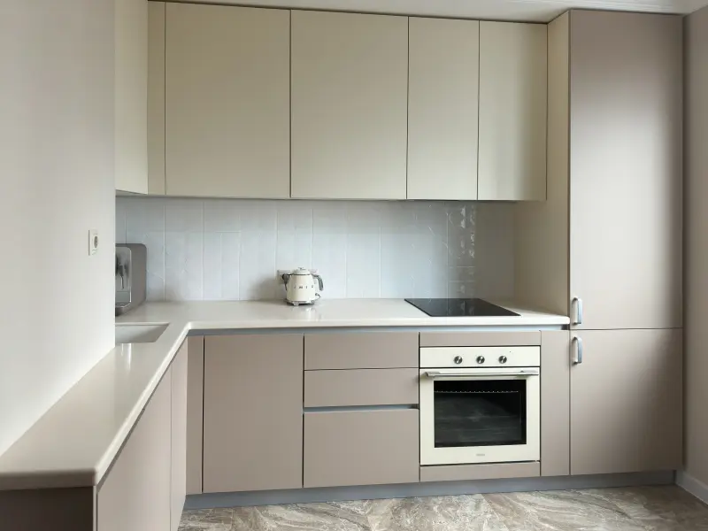 Кухня LРАЙФ535/AGT 730/AGT 732 для стильного интерьера вашего дома Эта компактная Г-образная угловая кухня выполнена в современном минималистичном стиле с элементами модерна и скандинавской эстетики. Светлый цвет мебели в оттенках слоновой кости и капучино с матовой поверхностью преображает пространство, делая его уютным и визуально просторным. Характеристики: - Материалы: Пластик и пленка, обеспечивающие долговечность и легкость в уходе. - Размеры: Компактная длина 2,3 м для эффективного использования небольших помещений площадью до 8 кв.м. - Столешница: Выполнена из прочного искусственного камня и акрила. - Комплектация: Полный набор функциональных элементов — встроенный вентиляционный короб, холодильник, духовой шкаф, варочная панель, мойка и пенал. Доводчики обеспечивают плавное закрытие дверок. - Назначение: Идеально подходит для дома, квартиры, студии, гостиной или дачи. Эта встроенная корпусная кухня сочетает в себе стиль, эргономику и практичность, создавая комфортное рабочее пространство. Кухня станет центральным местом вашего интерьера и подчеркнет современный стиль вашей жизни.