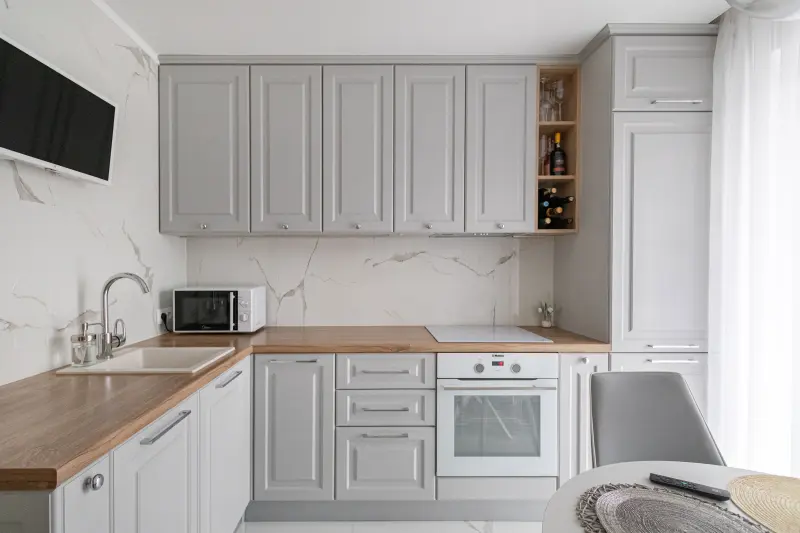 Кухня ЛТВД198/МДФ1 Палас Сильвер — стильное и функциональное решение для интерьера современного дома или квартиры. Эта Г-образная угловая кухня выполнена в утонченном светло-сером матовом цвете, который гармонично впишется в интерьеры в стиле прованс, кантри, неоклассика или современная классика. Основные характеристики: - Материалы: Корпуса фасадов облицованы пленкой, что обеспечивает долговечность и простой уход за поверхностями. - Столешница: Изготовлена из прочного HPL-пластика от Egger, что делает её устойчивой к влаге, высоким температурам и внешним повреждениям. - Размеры: Компактные габариты длиной 3 м, подходящие для небольшой площади (около 10 кв.м). - Назначение: Идеально подходит для дома, квартиры, студии или даже офиса. - Цвет и стиль: Светло-серый оттенок с матовой поверхностью создаёт уютную и стильную атмосферу, дополненную элегантным дизайном. - Функциональность: Кухня оснащена мойкой и столешницей, а также включает удобные системы хранения с полками, ящиками и шкафами. Стильный внешний вид кухни дополнен классической отделкой фасадов, а деревянные акценты столешницы добавляют ощущение тепла и уюта. Проект кухни полностью продуман для максимального удобства, идеально подходя как для приготовления еды, так и для комфортного времяпровождения дома.