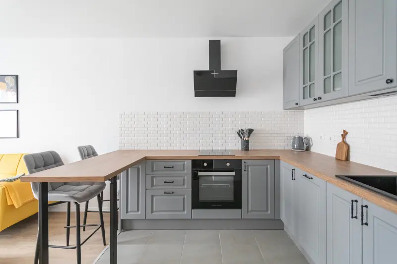Комплектация: С барной стойкой, С варочной панелью, Со столешницей, Встроенная корпусная мебель, С духовкой, С доводчиками, С вытяжкой