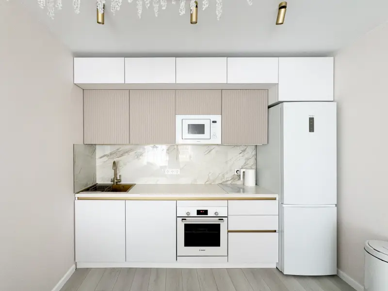 Кухонный гарнитур ЛТВДФ490/Система Белоснежный Софт ОМ 0865/Берег Сантьяго — стильное и современное решение для небольшой кухни. Сочетание минимализма и скандинавского дизайна делает эту мебель гармоничным элементом интерьера. Особенности: - Материалы: Эмаль и пленка, подчеркивающие долговечность и изысканный матовый оттенок. - Цветовая палитра: Светлые тона с акцентом на белый, золотой и капучино. Эстетика дополнена мягкой матовой текстурой. - Форма: Прямая линия гарнитура подходит для компактных помещений площадью до 10 кв. м. - Размеры: Оптимальная длина — 3 м. Комплектация: - Фурнитура без ручек: Элегантное решение для современного стиля. - Доводчики в ящиках и дверцах: Для комфортного и бесшумного использования. - Встроенная техника: Гарнитур оснащен встроенной духовкой и варочной панелью. - Столешница: Искусственный камень акрилового типа с прочным и износостойким покрытием. Применение: Идеально подходит для дома, квартиры или студии. Выполненная в современном стиле, кухня гармонично дополнит пространство гостиной, придавая ему опрятный и стильный вид. Этот кухонный гарнитур станет вашим помощником в создании уютной и функциональной кухни для комфортного приготовления пищи и приятного времяпрепровождения.