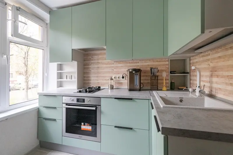 Фасады:Фасад AGT 735 Зелёный шёлк матовый (Soft Touch Relax Green)Корпус:U708-ST9 Светло-серыйСтолешница:38 E-F186-ST9 Бетон Чикаго светло-серый