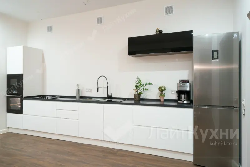 Кухня на заказ ЛМЖ100\RAL 9016 глянец Современная кухня модель ЛМЖ100 выполнена в минималистичном дизайне, идеально подходящем для интерьеров в стилях модерн, скандинавский или минимализм. Характеристики: - Материал фасадов: Эмаль с глянцевым покрытием, создающим стильный и современный вид. - Форма: Прямая, длиной 4,5 метра — прекрасно подойдет для просторных помещений. - Цвет: Белоснежный оттенок RAL 9016 с глянцевой поверхностью, визуально увеличивающей пространство и создающей ощущение чистоты. - Размер и площадь: Обустройство кухни площадью 18 м-. Комплектация: - Удобная столешница из искусственного акрилового камня — практичная и долговечная. - Отсутствие верхних шкафов делает пространство кухни более легким и современным. - Встроенная варочная панель, духовой шкаф и посудомоечная машина. - Эргономичный пенал для хранения. - Мебель без ручек, что подчеркивает минималистичный стиль. Назначение: Подойдет для оборудования кухни как в квартире, так и в частном доме. Дизайн идеален для совмещения кухни с гостиной зоной. Кухня ЛМЖ100 — это удачное сочетание современного дизайна, функциональности и эстетики.