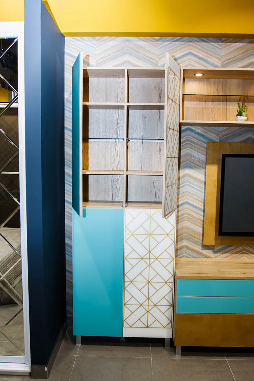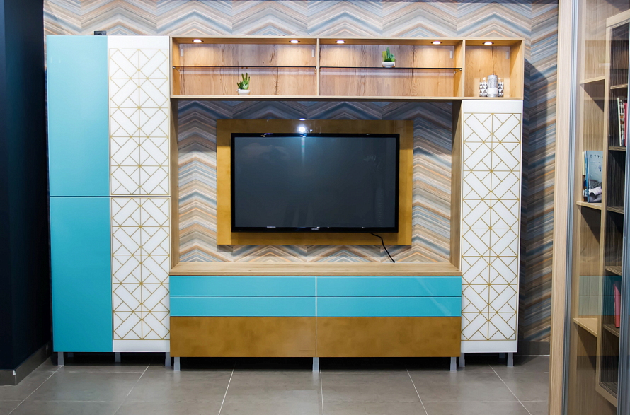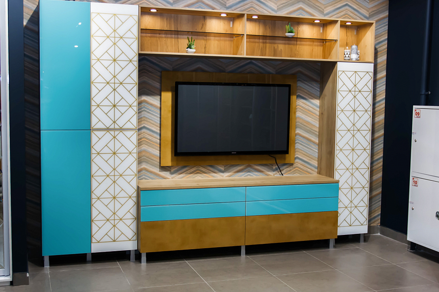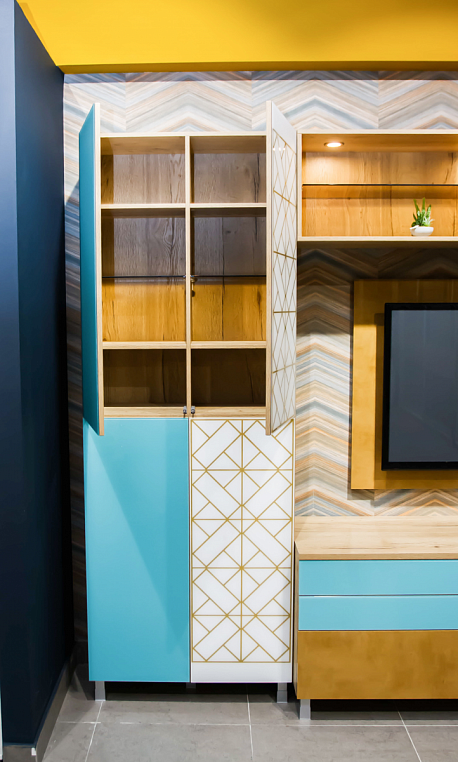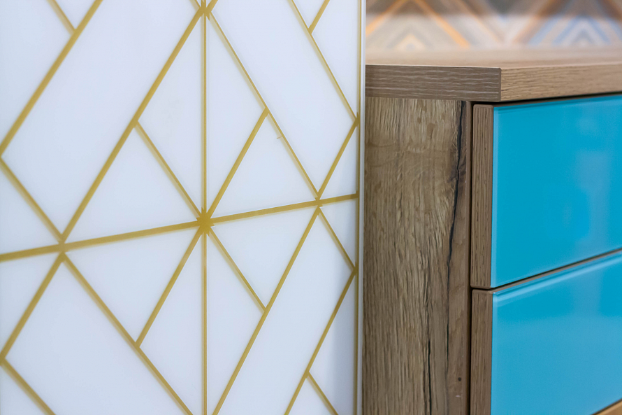 Фасад: ЛДСП Egger, стекло глянец с покрасом, стекло с цветным песком и матированием