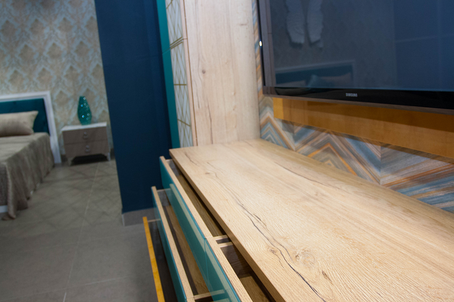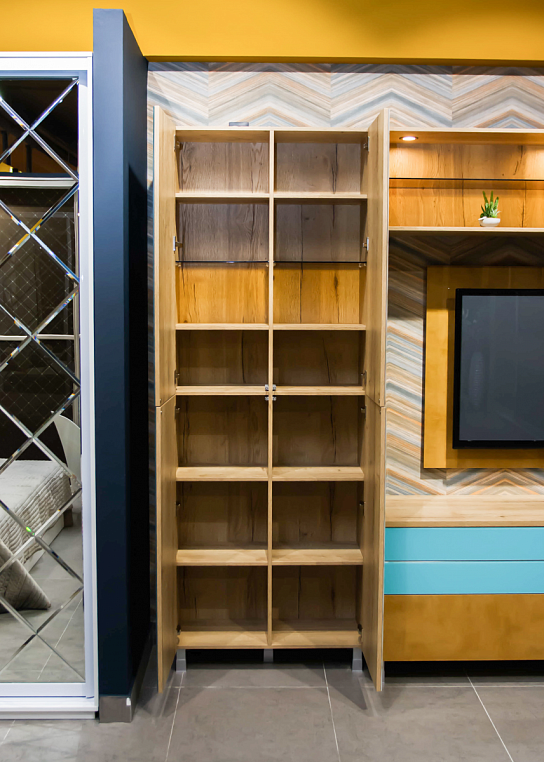 Внутреннее наполнение: полки ЛДСП Egger 9, полки стекло бронза 8, ящики c фурнитурой Blum 6 шт