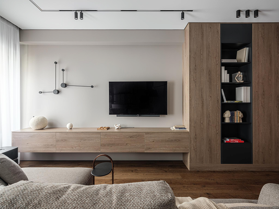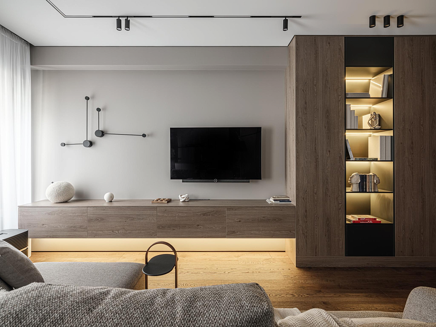 Гостиная, оформленная в мужском стиле, сочетает в себе функциональность и элегантность. Мебель изготовлена из ЛДСП Egger в декоре Дуб Денвер трюфель, который комбинирует в себе множество цветовых переходов, а также теплых и холодных оттенков, что придает гостиной особый шарм и привлекательность. Центром композиции является навесная тумба, которая служит тв-зоной и гармонично вписывается в общий стиль комнаты. Продолжением тумбы является шкаф с глухими фасадами. Он оснащен открытыми полками в центральной части, которые добавляют пространству легкости. Полки выполнены в контрастном декоре Серый уголь. Этот интересный декор с синим оттенком идеально гармонирует с древесной репродукцией, создавая стильный и современный образ гостиной. В полки встроена светодиодная лента, которая не только освещает комнату, но и создает уютную атмосферу. Такая гостиная подчеркивает хороший вкус владельца и является идеальным местом для отдыха.