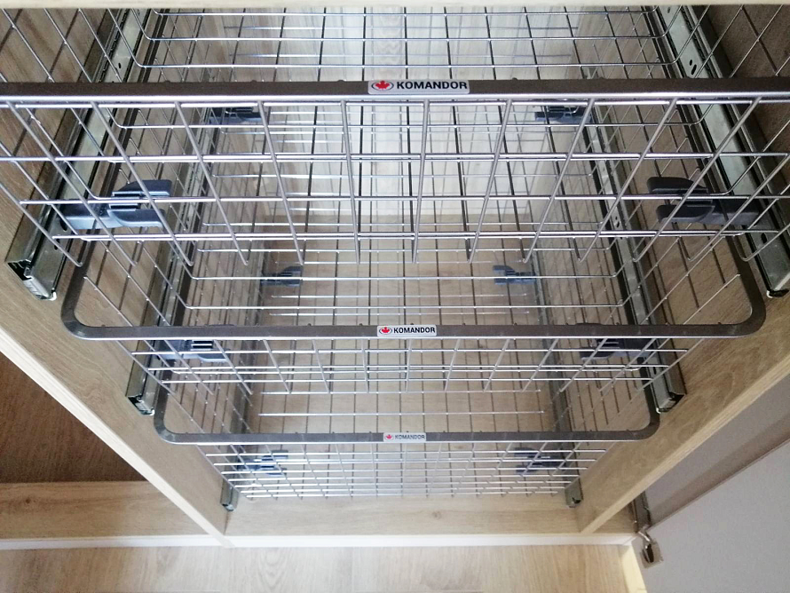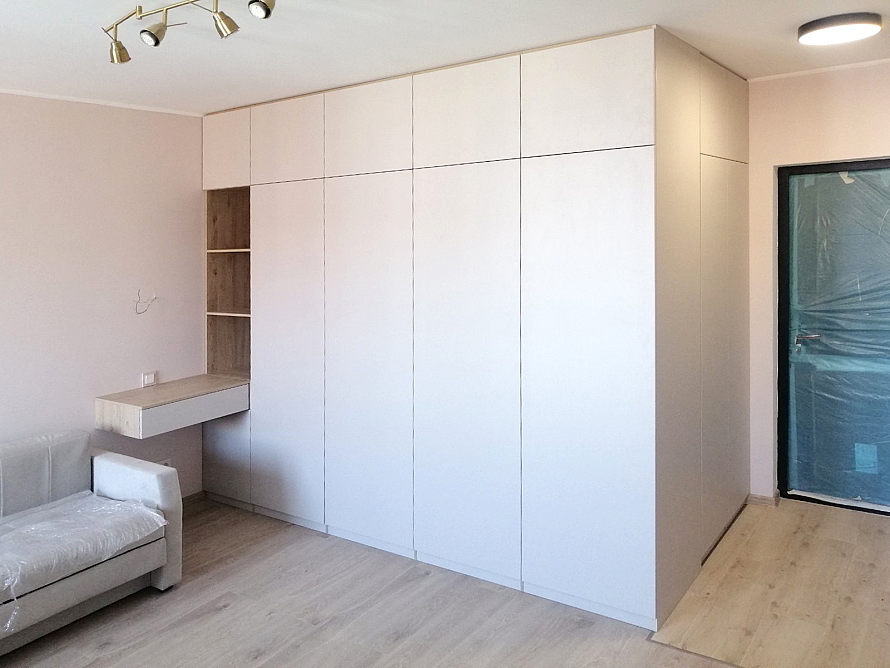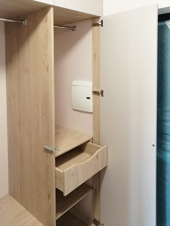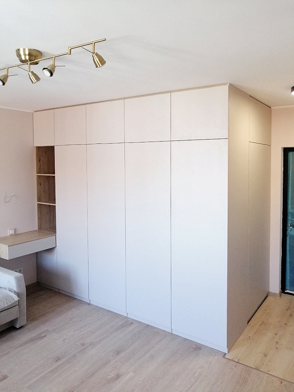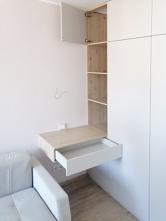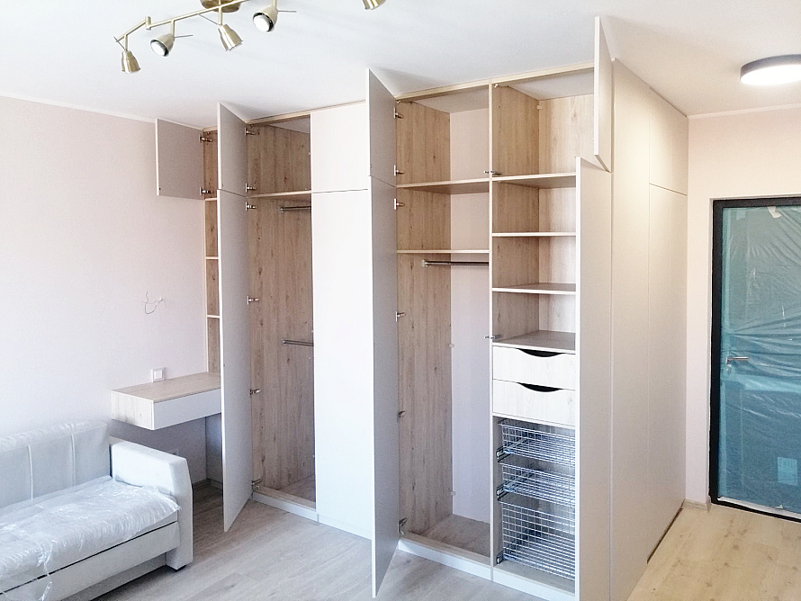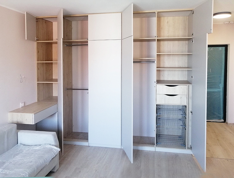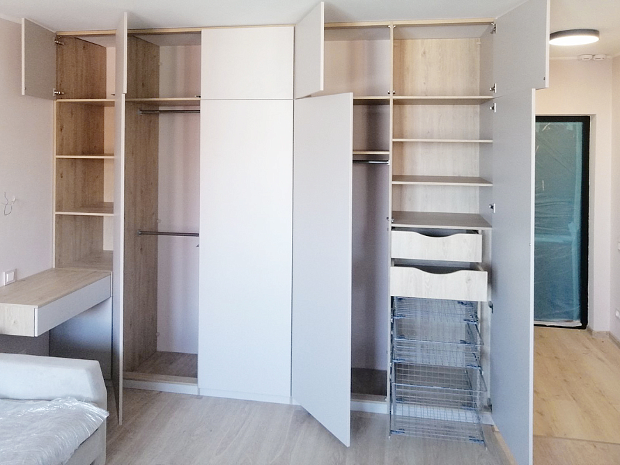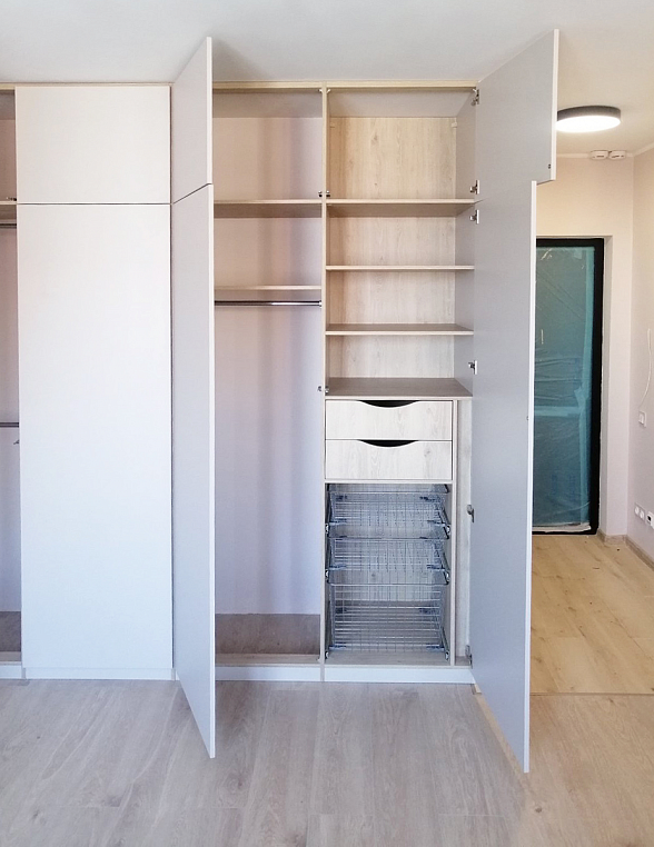 Угловое встроенное изделие, которое предназначено для выполнения функций сразу в нескольких зонах. Одна сторона изделия выполняет функцию прихожей и предназначена для хранения верхней одежды, а вторая часть изделия выполняет функцию гардеробной, где спроектированы различные зоны хранения вещей - полки, ящики, корзины, штанги. Небольшой навесной ящик является не только неотъемлемой частью изделия, но и его изюминкой. Все фасады шкаф открываются легким нажатие, т.к. оборудованы tip-on от Blum. Фасад изделия выполнен из ЛДСП Egger в цвете Кашемир серый, а корпус изделия - ЛДСП Egger в цвете Дуб Давос натуральный.